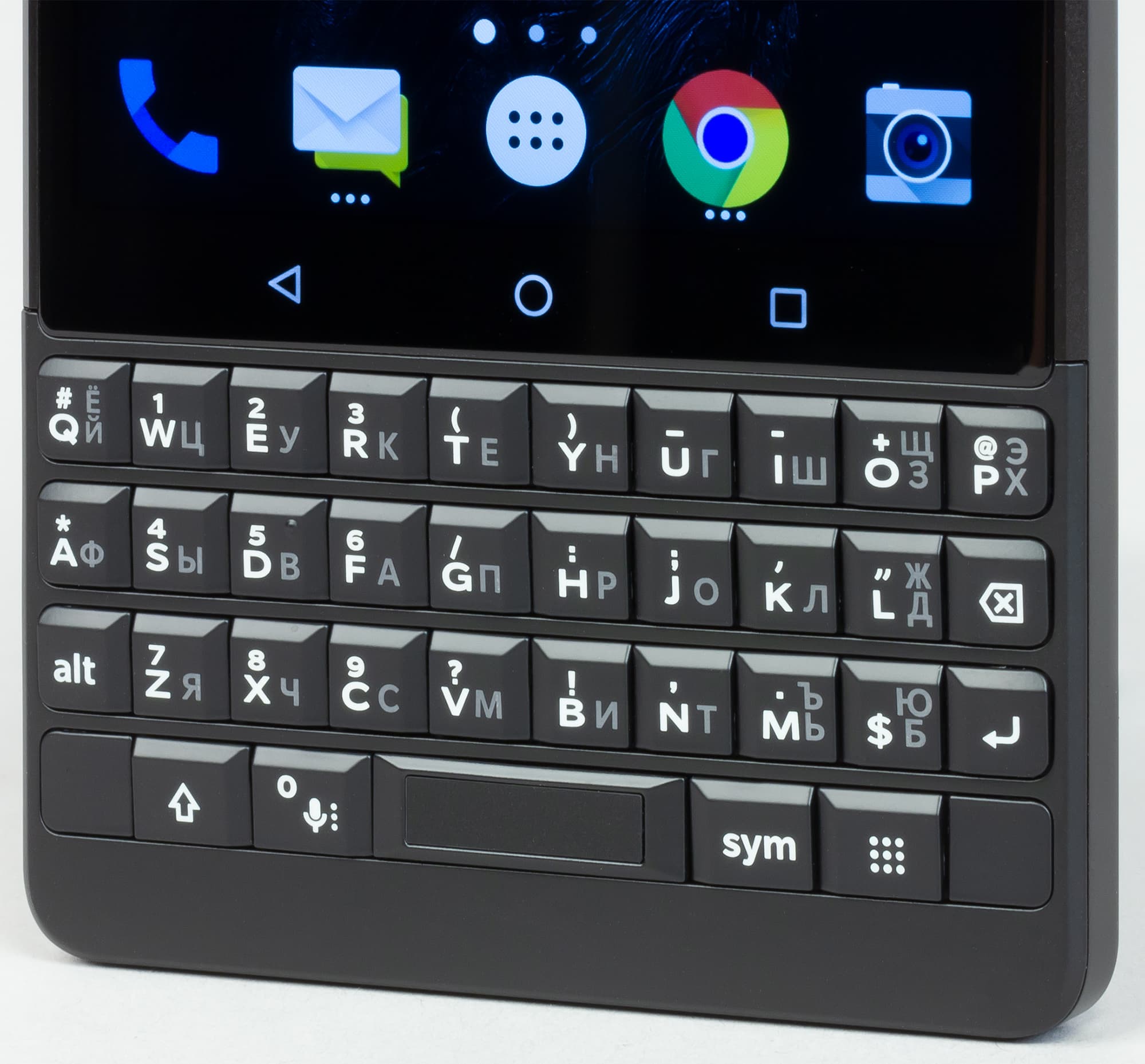 Впрочем, можно не пользоваться механическими клавишами вовсе: под экраном расположены еще и три сенсорные кнопки, которые выполняют стандартные функции кнопок обычного смартфона на Android (переход домой, назад и к списку открытых приложений). В клавишу «пробел» вписан сканер отпечатков пальцев. Для российского рынка официально предусмотрена локализация клавиатуры, на клавиши нанесены буквы русского алфавита наряду с латинским, но из-за разницы в числе символов алфавита некоторые русские буквы придется набирать двойным нажатием. Неприятно, но это единственный вариант для компактных решений.