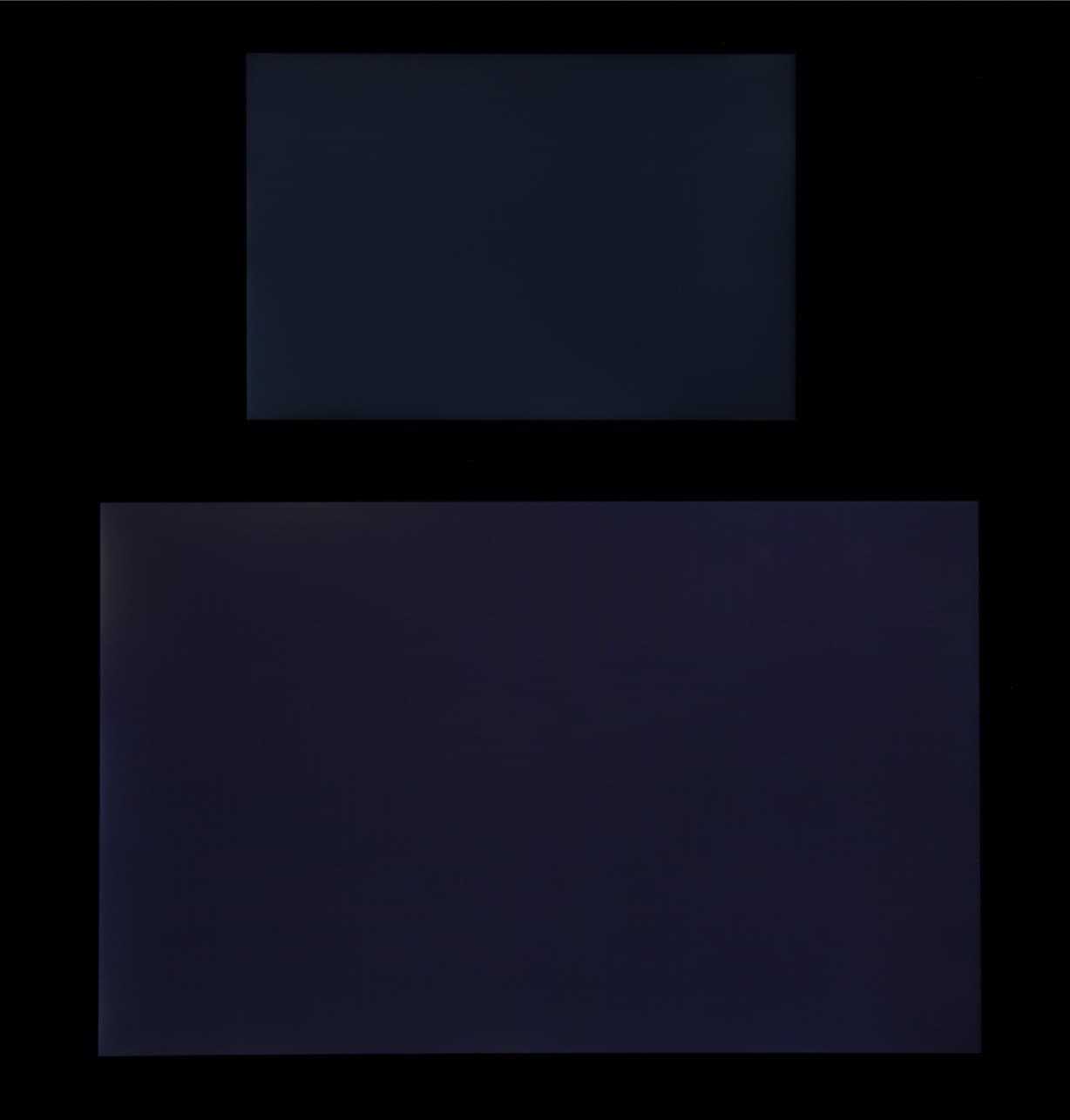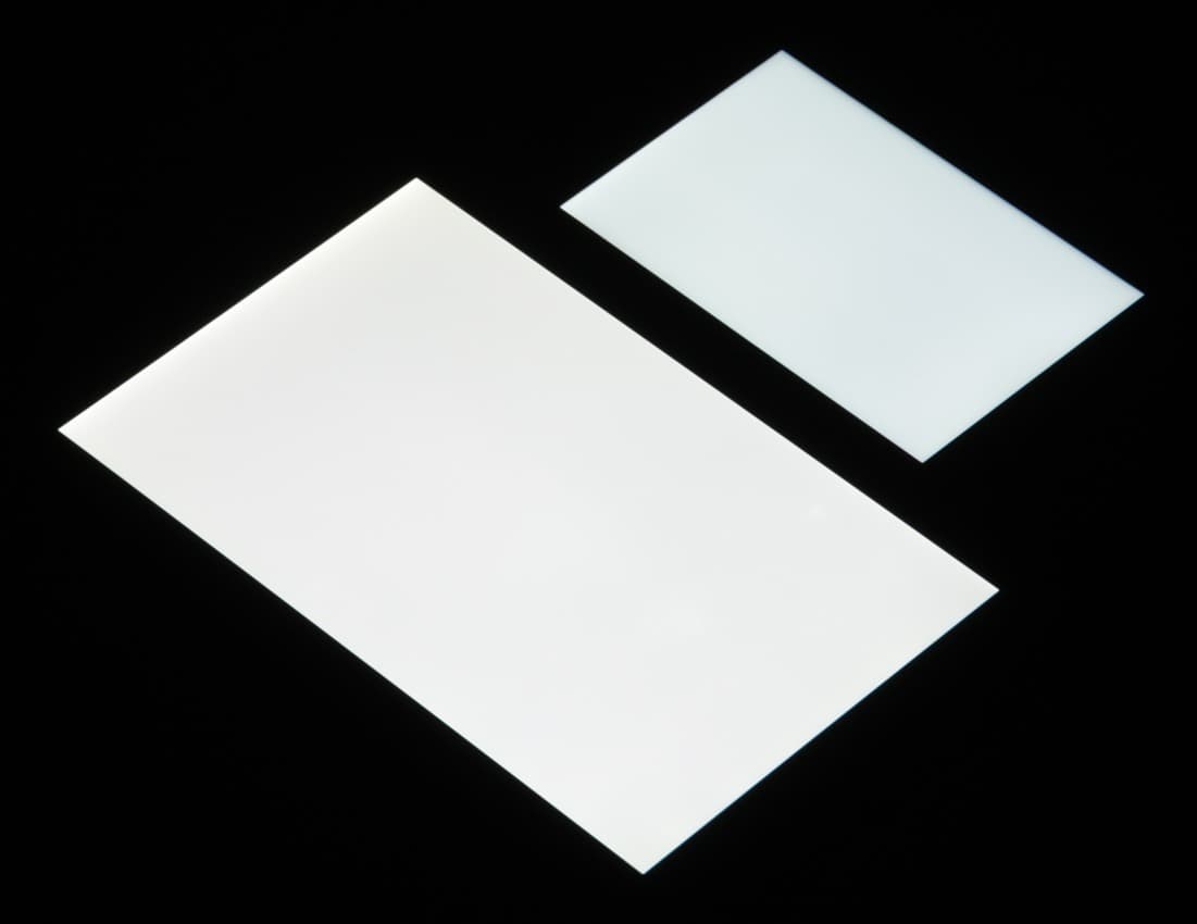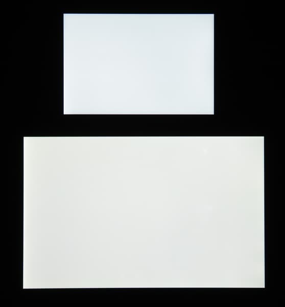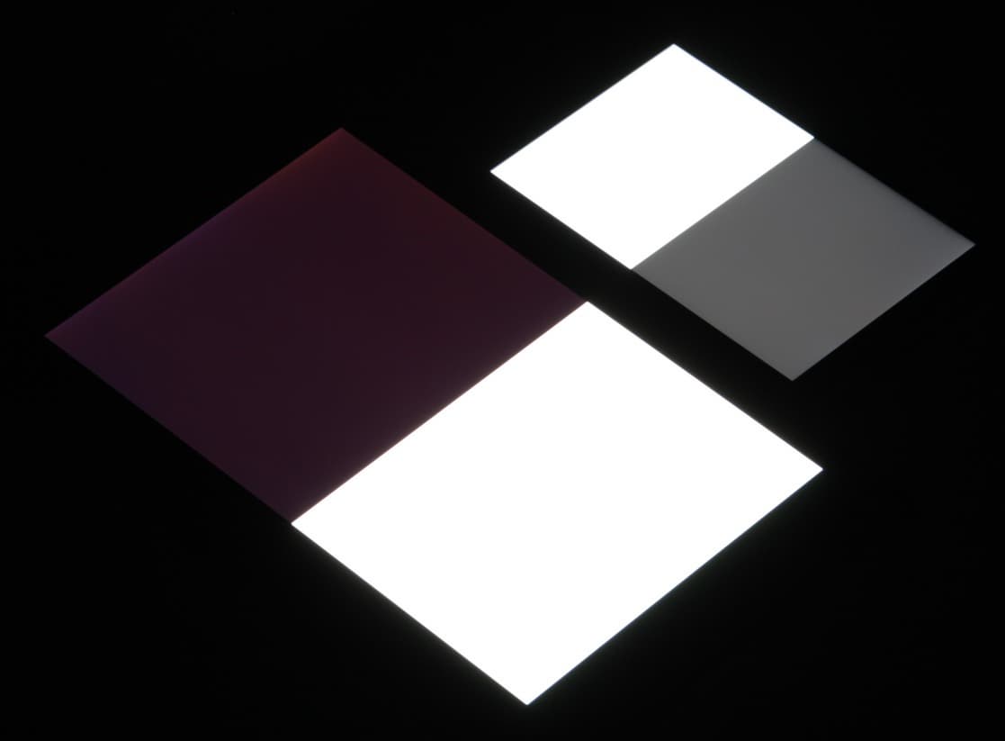 Черное поле при отклонении по диагонали сильно высветляется, но остается условно нейтрально-серым по оттенку. Фотографии ниже это демонстрируют (яркость белых участков в перпендикулярном плоскости экранов направлении одинаковая!):