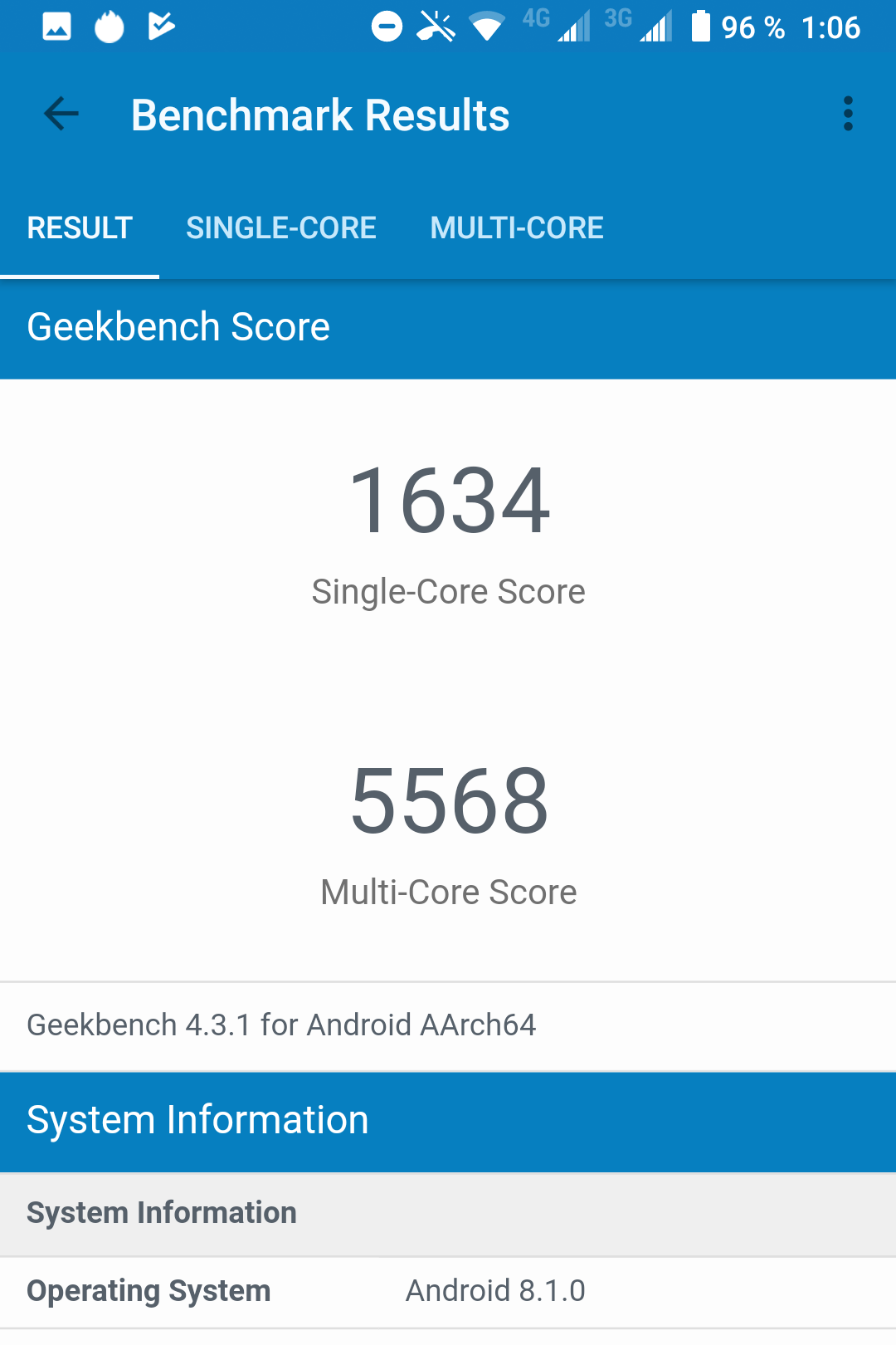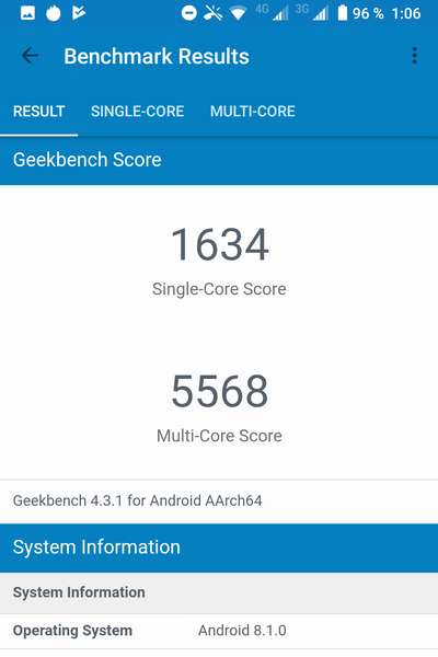 | GeekBench (v4.x) (больше — лучше) | 1634/5568 | — | 1344/4916 | 1528/4387 | 1615/5638 |