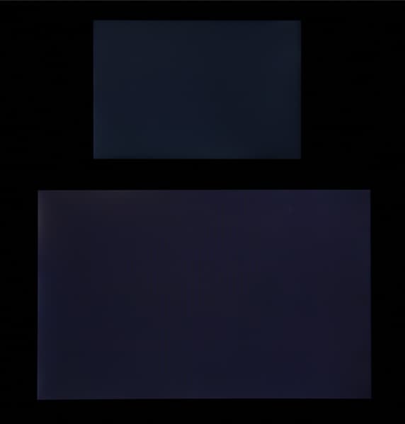 При перпендикулярном взгляде равномерность черного поля хорошая, но не идеальная (для наглядности подсветка установлена на максимальную яркость):