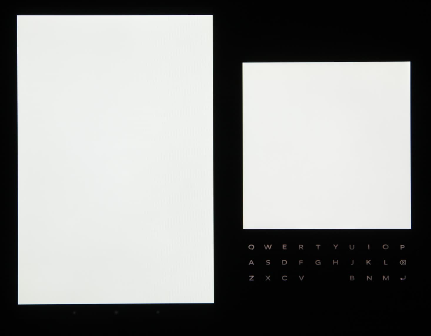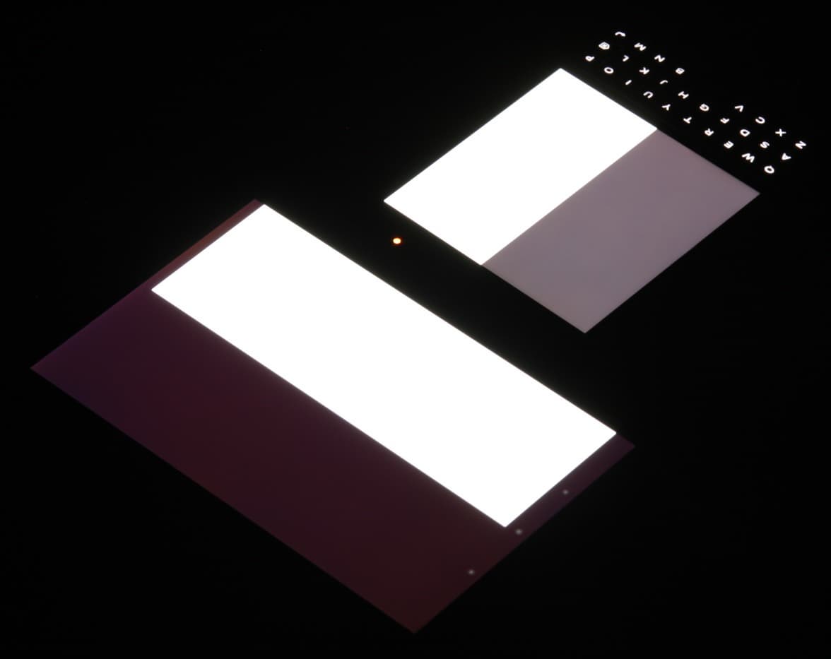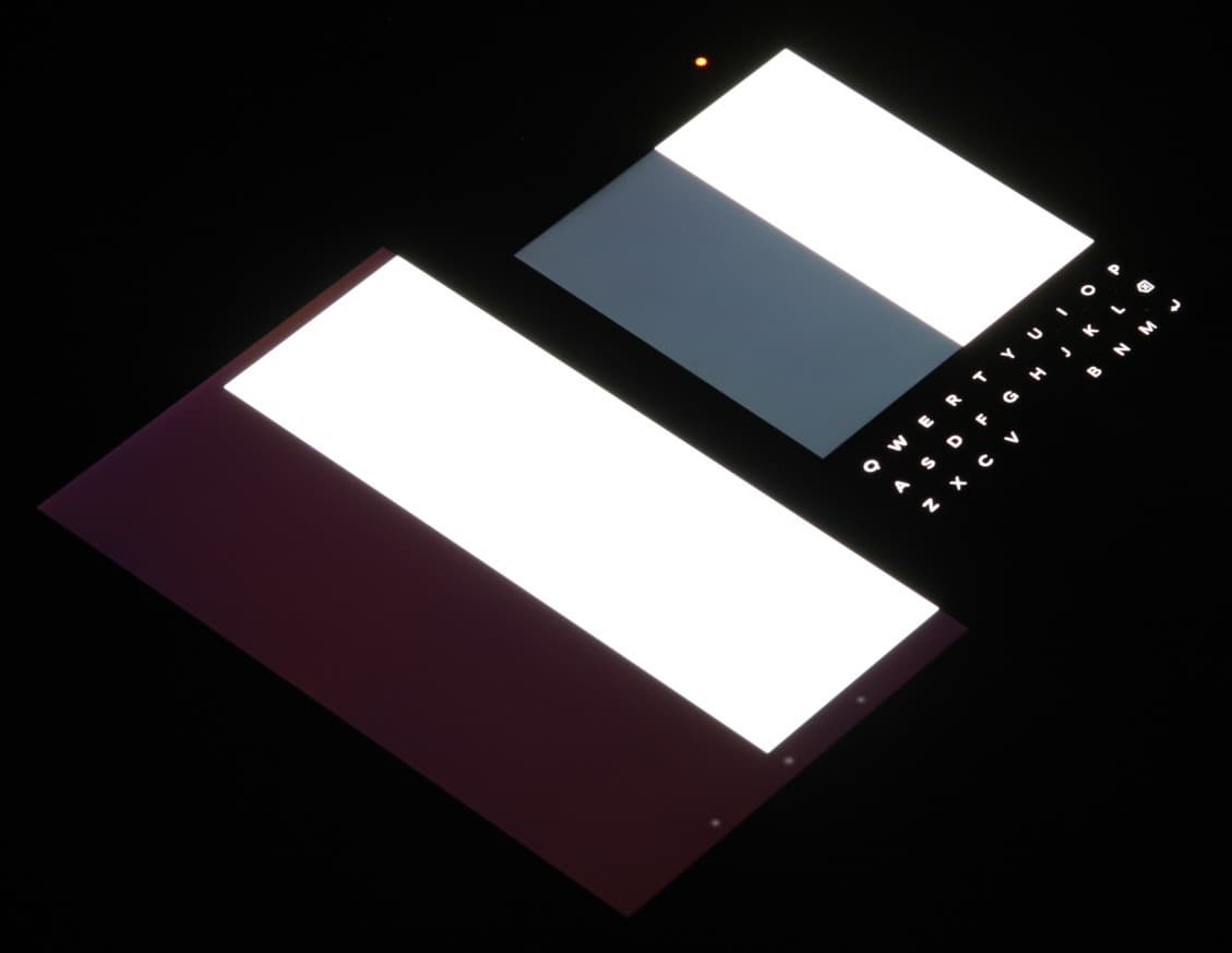 Яркость под углом у экранов уменьшилась (как минимум в 4 раза, исходя из разницы в выдержке), но в случае BlackBerry Passport падение яркости чуть меньше. Черное поле при отклонении по диагонали высветляется сильно и приобретает легкий фиолетовый, или красно-фиолетовый оттенок, или остается примерно нейтрально-серым. Фотографии ниже это демонстрируют (яркость белых участков в перпендикулярном плоскости экранов направлении примерно одинаковая!):