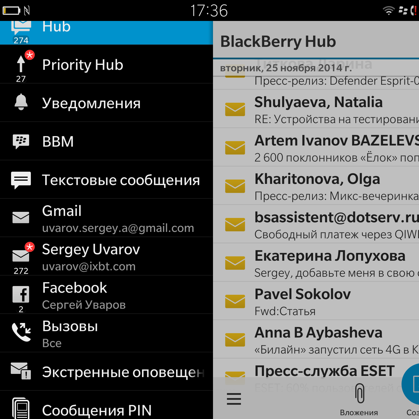 Как и раньше, ключевую роль играет BlackBerry Hub — агрегатор всех событий, сообщений, уведомлений и т. п. Это действительно очень удобно, хотя далеко не все там сделано интуитивно понятно. Например, без чтения руководств и блуждания по интернету невозможно понять, как отметить все письма как прочитанные.