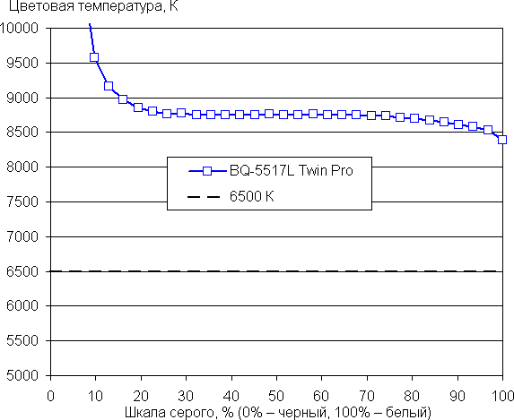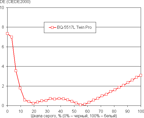 Баланс оттенков на шкале компромиссный, так как цветовая температура существенно выше стандартных 6500 К, но отклонение от спектра абсолютно черного тела (ΔE) на большей части шкалы серого ниже 10, что для потребительского устройства считается хорошим показателем. При этом цветовая температура и ΔE мало изменяются от оттенка к оттенку — это положительно сказывается на визуальной оценке цветового баланса. (Самые темные области шкалы серого можно не учитывать, так как там баланс цветов не имеет большого значения, да и погрешность измерений цветовых характеристик на низкой яркости большая.)