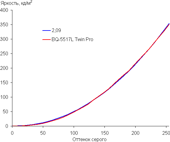 Контрастность (примерно в центре экрана) высокая — порядка 1100:1. Время отклика при переходе черный-белый-черный равно 27 мс (15 мс вкл. + 12 мс выкл.). Переход между полутонами серого 25% и 75% (по численному значению цвета) и обратно в сумме занимает 45 мс. Построенная по 32 точкам с равным интервалом по численному значению оттенка серого гамма-кривая не выявила завала ни в светах, ни в тенях. Показатель аппроксимирующей степенной функции равен 2,09, что ниже стандартного значения 2,2. При этом реальная гамма-кривая немного отклоняется от степенной зависимости: