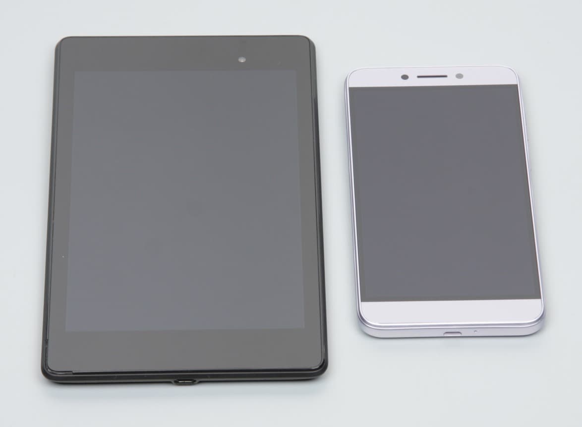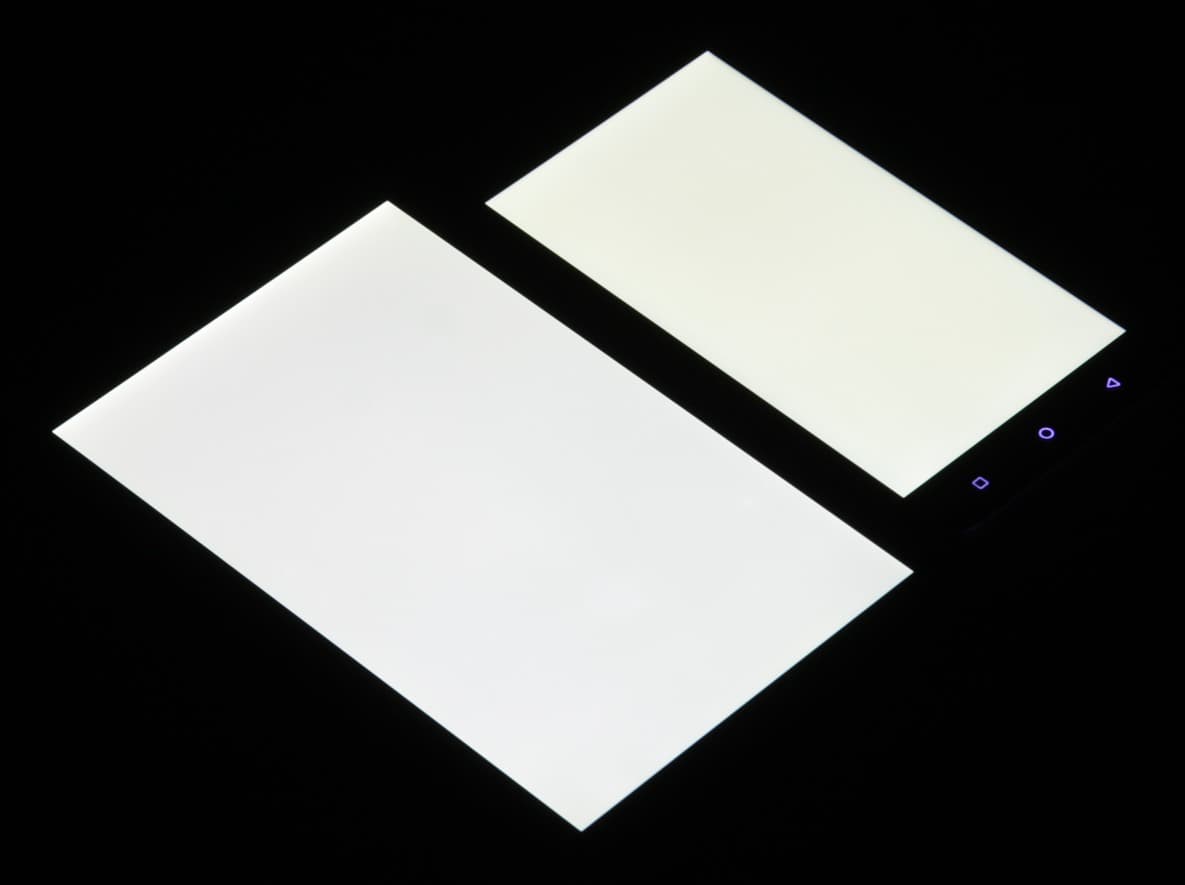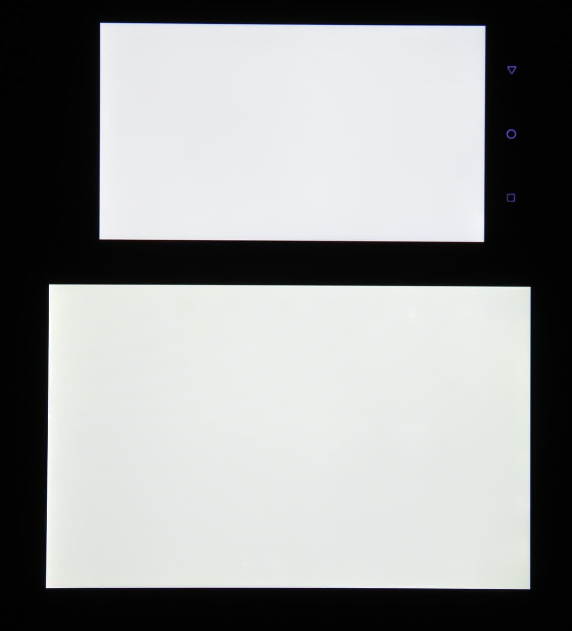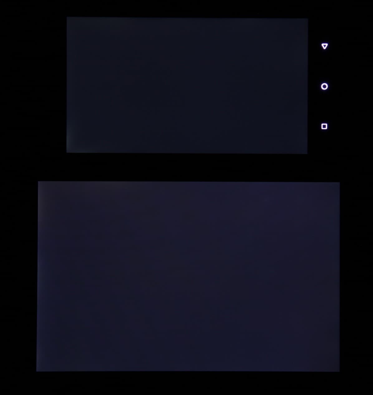 Лицевая поверхность экрана выполнена в виде стеклянной пластины с зеркально-гладкой поверхностью, устойчивой к появлению царапин. Судя по отражению объектов, антибликовые свойства экрана лучше, чем у экрана Google Nexus 7 (2013) (далее просто Nexus 7). Для наглядности приведем фотографию, на которой в выключенных экранах отражается белая поверхность (слева — Nexus 7, справа — BQ-5517L Twin Pro, далее их можно различать по размеру):