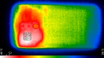 Нагрев локализован в верхней части аппарата ближе к правому краю, что, видимо, соответствует расположению микросхемы SoC. По данным теплокамеры, максимальная температура составила 48 градусов (при температуре окружающего воздуха в 24 градуса), это очень сильный нагрев.