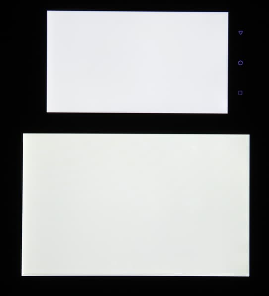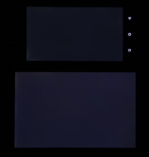 При перпендикулярном взгляде равномерность черного поля средняя, ближе к краю черное поле местами заметно высветляется (для наглядности подсветка установлена на максимальную яркость):