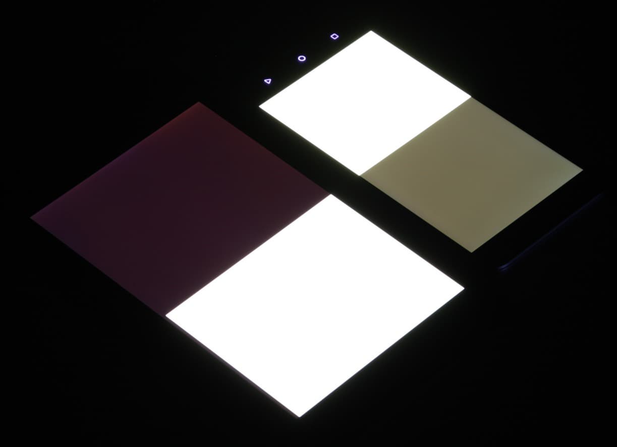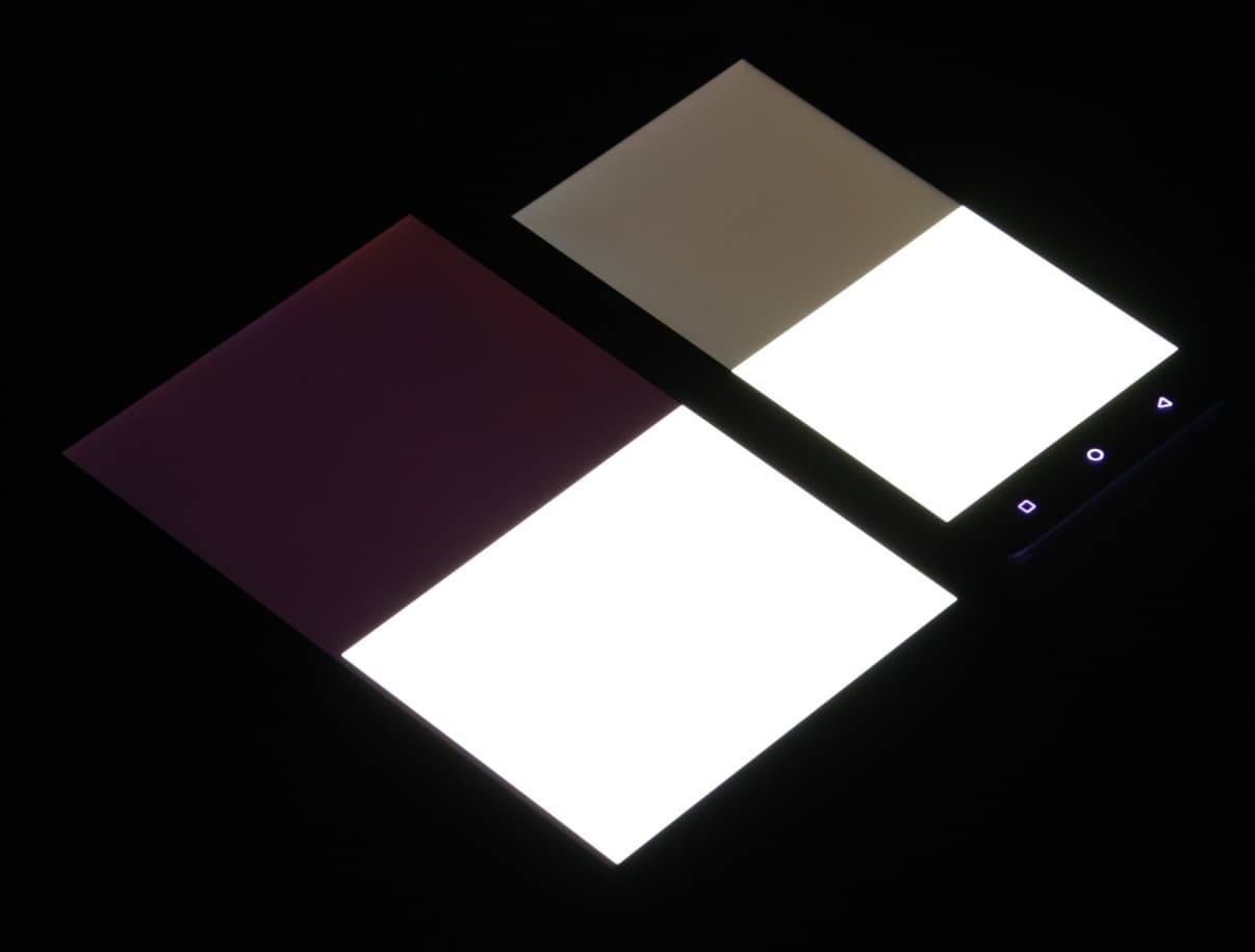 Черное поле при отклонении по диагонали сильно высветляется и приобретает красноватый оттенок. Фотографии ниже это демонстрируют (яркость белых участков в перпендикулярном плоскости экранов направлении одинаковая!):