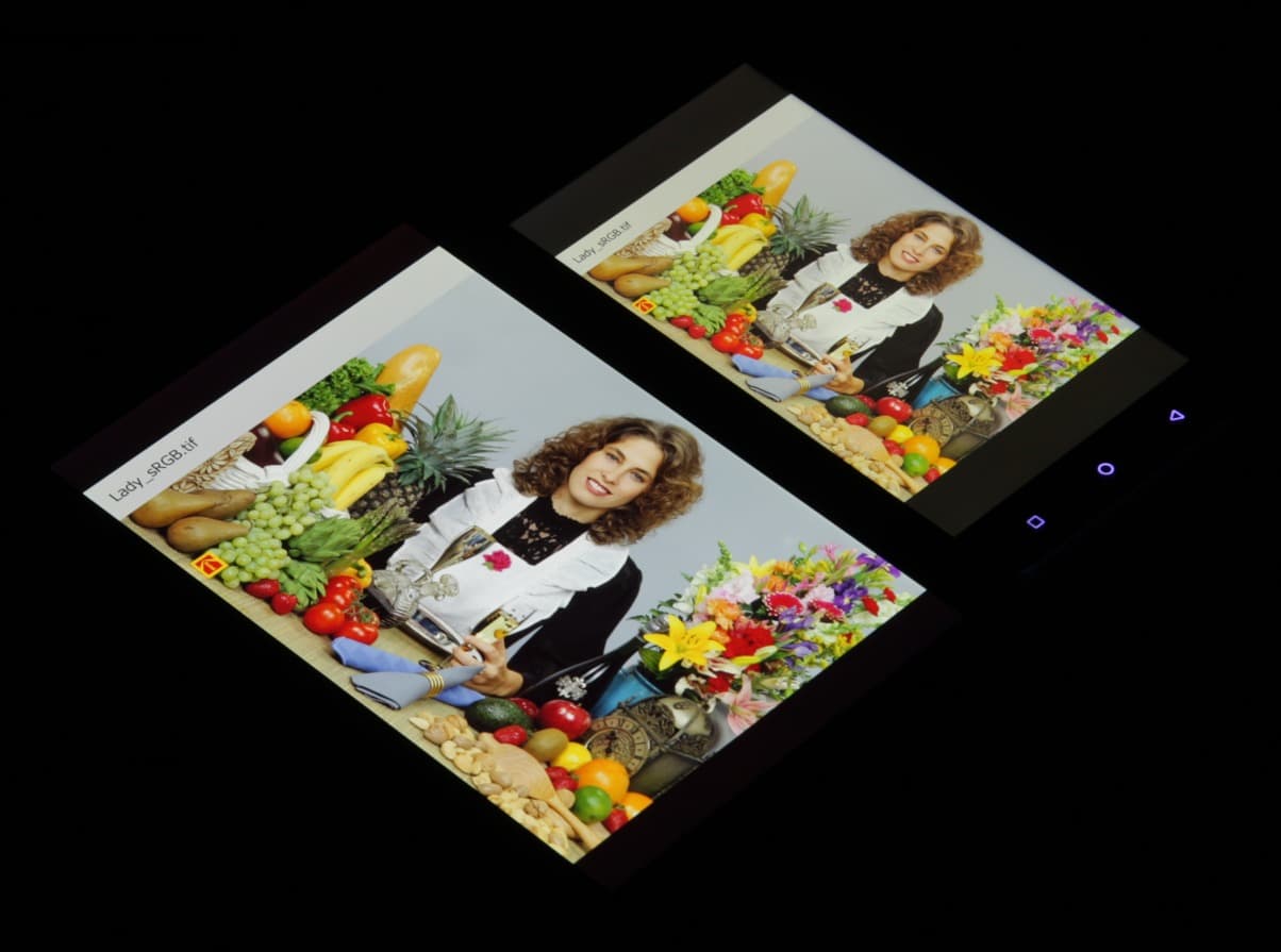 Экран имеет хорошие углы обзора без значительного сдвига цветов даже при больших отклонениях взгляда от перпендикуляра к экрану и без инвертирования (кроме самых-самых темных при отклонении по одной диагонали) оттенков. Для сравнения приведем фотографии, на которых на экраны BQ-5517L Twin Pro и Nexus 7 выведены одинаковые изображения, при этом яркость экранов изначально установлена примерно на 200 кд/м², а цветовой баланс на фотоаппарате принудительно переключен на 6500 К.