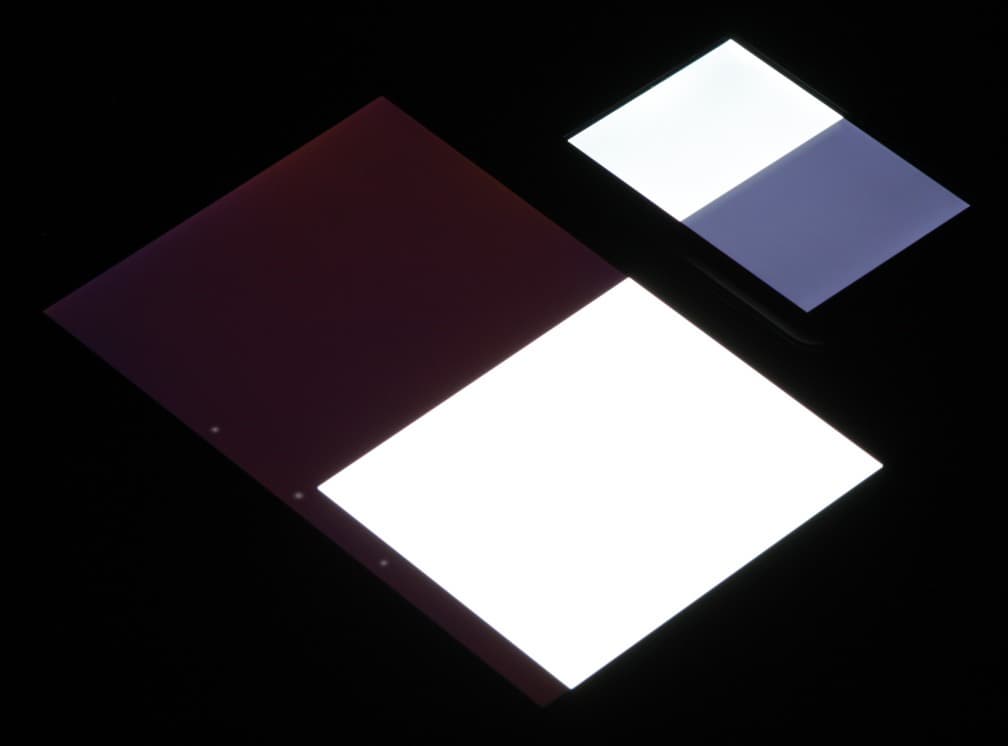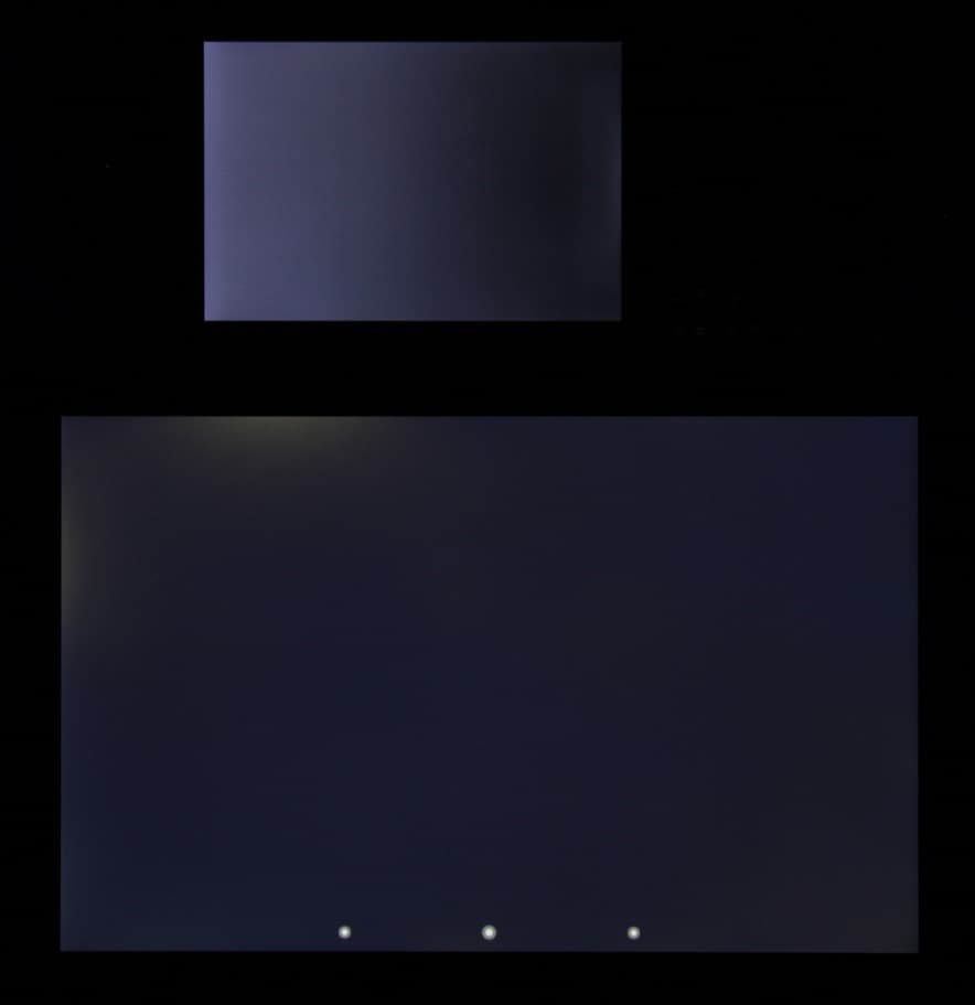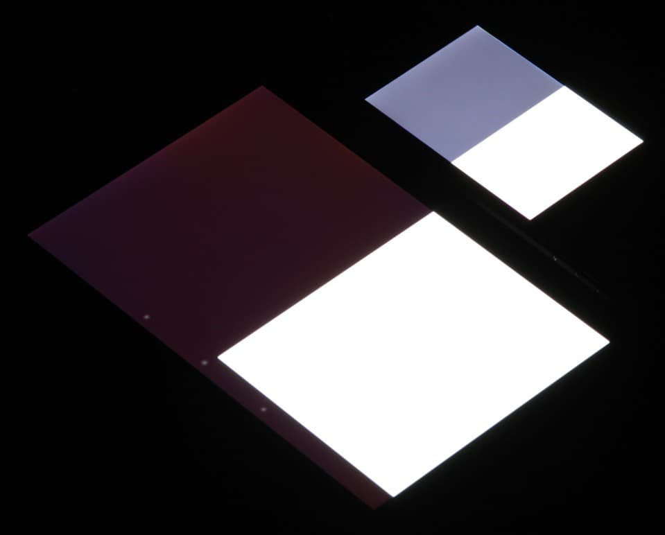 Черное поле при отклонении взгляда от перпендикуляра к экрану высветляется сильно, но остается примерно нейтрально-серым по оттенку: