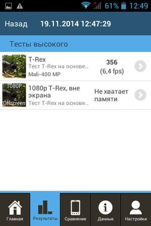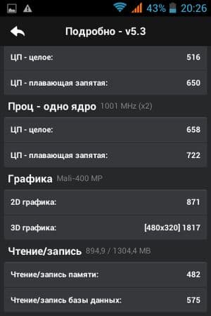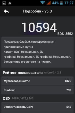 Что касается конкретных цифр в бенчмарках, то по результатам популярного AnTuTu производительность у аппаратной начинки героя обзора оказалась настолько низкой, что аналогов среди ранее протестированных по единой методике мобильных устройств не нашлось. Правда, никто из них и не обладает столь малым объемом оперативной памяти, и это вполне очевидно сказывается самым плачевным образом на общей производительности в тестах. Из-за малого количества выделенной памяти смартфон частично не смог осились или целиком не справился с некоторыми нашими стандартными тестами, такими как EpicCitadel, 3DMark и собственным браузерным Google Octane.