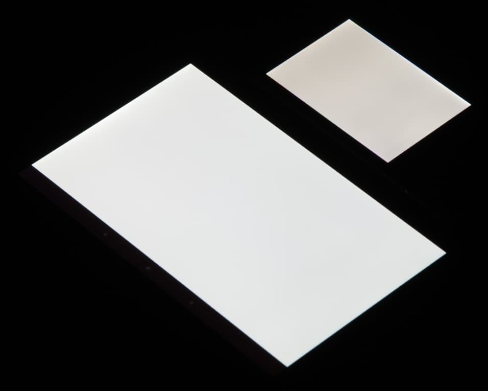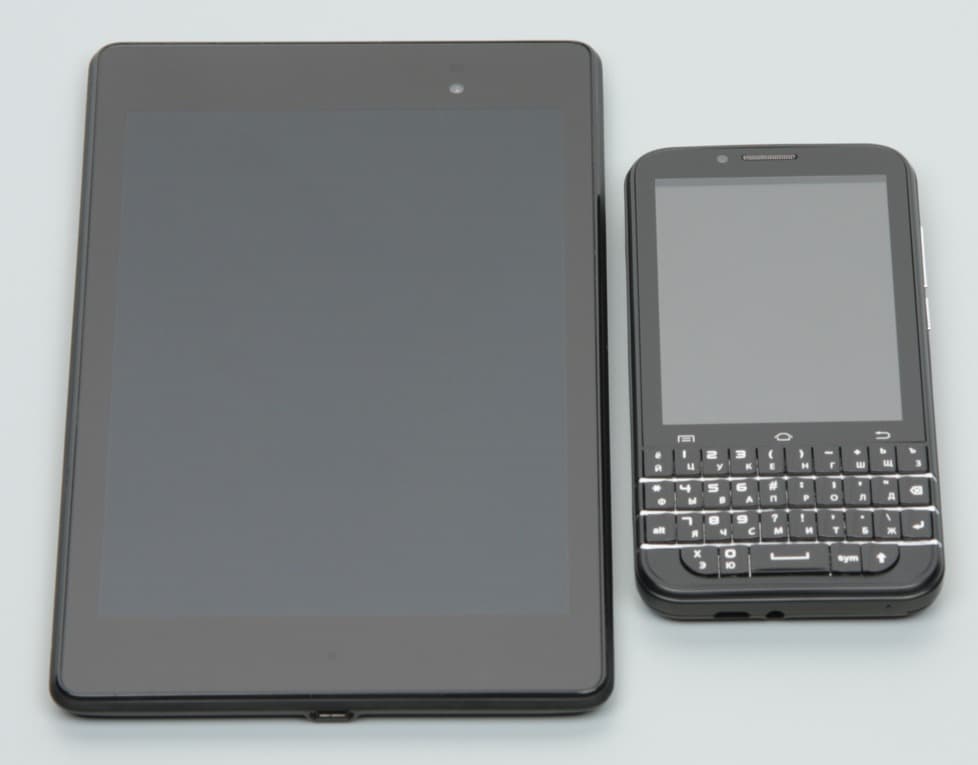 Лицевая поверхность экрана выполнена в виде стеклянной пластины с зеркально-гладкой поверхностью, устойчивой к появлению царапин. Судя по яркости отраженных объектов, антибликовые свойства экрана гораздо хуже, чем у Google Nexus 7 (2013) (далее мы сравниваем именно с ним). Поверхность самой матрицы под стеклом слегка матовая, поэтому экран отражает как прямые источники света (внешней поверхностью), так и рассеянный свет (поверхностью матрицы), это уменьшает читаемость в условиях сильной внешней засветки. Для наглядности приведем фотографию, на которой в выключенных экранах обоих устройств отражается белая поверхность (BQ Berkeley легко отличить, так как он меньше):