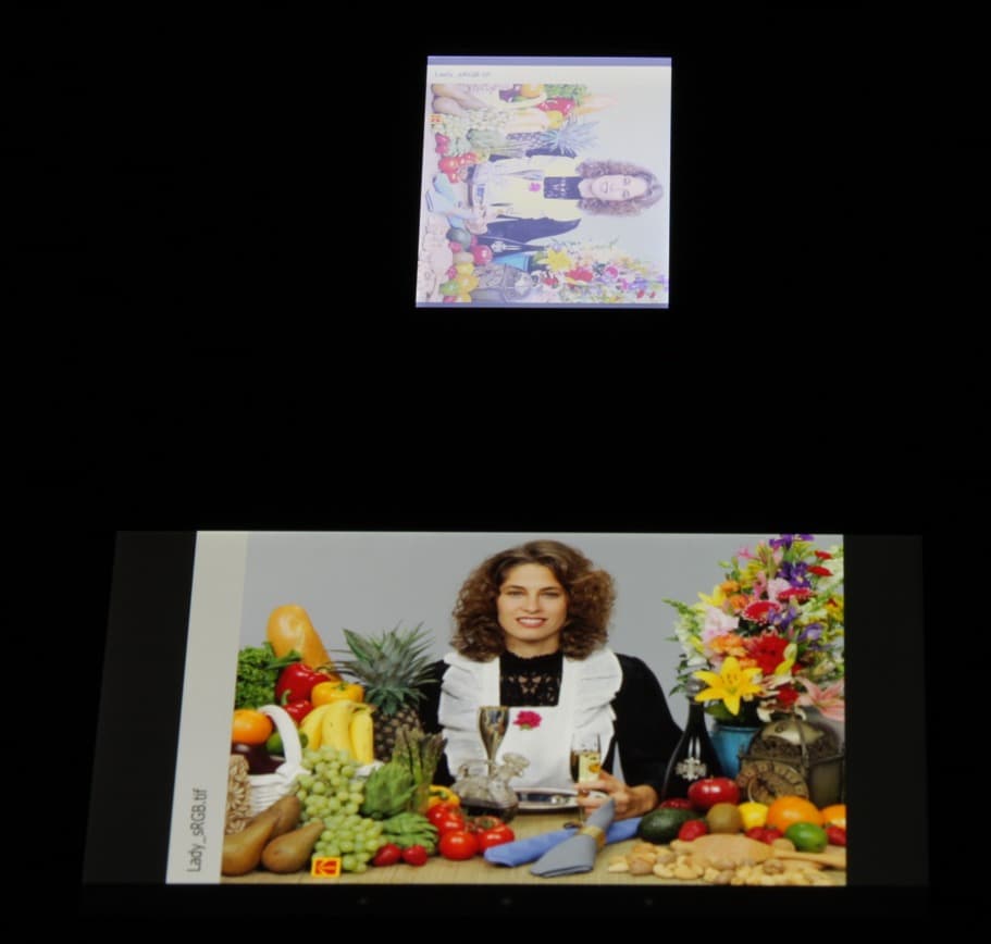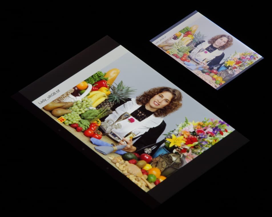 Экран имеет не самые плохие углы обзора в горизонтальном направлении, но при малейшем отклонении вверх инвертируются темные оттенки, при отклонении вниз — светлые. Для сравнения приведем фотографии, на которых на экраны Nexus 7 и тестируемого устройства выведены одинаковые изображения, при этом яркость обоих экранов установлена примерно на 200 кд/м², а цветовой баланс на фотоаппарате принудительно переключен на 6500 К. Перпендикулярно к экранам тестовая картинка: