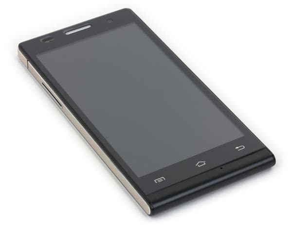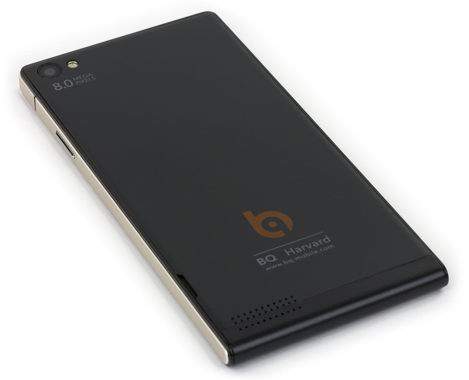 У смартфона имеется металлический широкий плоский ободок, опоясывающий все боковые грани, кроме нижней. Внизу можно обнаружить пластмассовый закругляющийся торец, который и был придуман дизайнерами Huawei для того, чтобы их детище хоть чем-то отличалось от популярного в то время Apple iPhone 4. Задняя крышка и нижнее закругление выполнены из твердого матового пластика без глянца, нет хромированного блеска и у матовой поверхности металлического ободка, так что смартфон в целом можно охарактеризовать как немаркий и нескользкий. В руке аппарат располагается вполне комфортно за счет небольших толщины и массы устройства, ширина корпуса позволяет удобно обхватывать его пальцами. Смартфон BQ Harvard нельзя назвать крупным, его габариты подходят для карманов любых размеров.