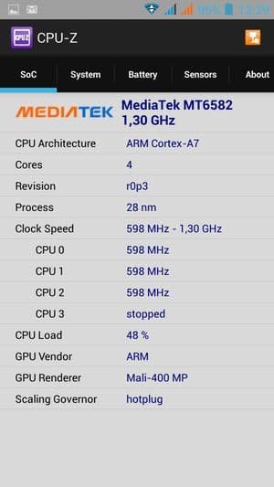 - SoC MediaTek MT6582, 1,3 ГГц, 4 ядра, ARM Cortex-A7
