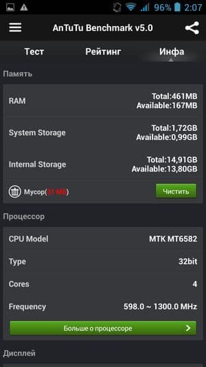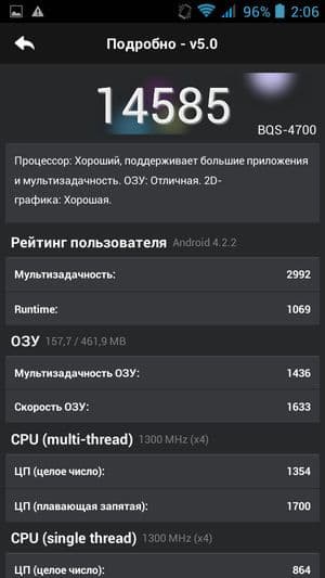 Что касается конкретных цифр в бенчмарках, то по результатам популярного AnTuTu производительность у аппаратной начинки героя обзора оказалась даже ниже чем у аналогов, работа которых строится на той же самой платформе. Правда, никто из них не обладает столь малым объемом оперативной памяти, и это вполне очевидно сказывается самым плачевным образом на общей производительности в тестах. По нашим прикидкам, в AnTuTu v4.x смартфон показал бы результат даже меньше 14К — хотя тот же Lenovo S660, например, демонстрировал там 17К и больше. Из-за малого количества выделенной памяти смартфон попросту отказался запускать большинство наших стандартных тестов, таких как 3DMark, EpicCitadel, Basemark X и др.