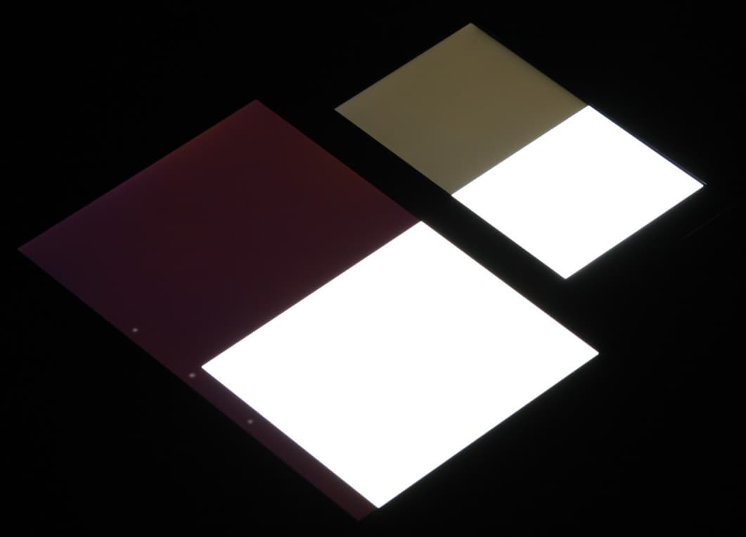 Яркость под углом у обоих экранов заметно уменьшилась (как минимум в 5 раз, исходя из разницы в выдержке), но в случае BQ Harvard падение яркости больше (яркость по фотографиям 218 против 228 у Nexus 7). При этом цветовой тон на экране BQ Harvard несколько изменился. Черное поле при отклонении по диагонали высветляется сильно и приобретает фиолетовый или слегка желтоватый оттенок. Фотографии ниже это демонстрируют (яркость белых участков в перпендикулярном плоскости экранов направлении у экранов одинаковая!):
