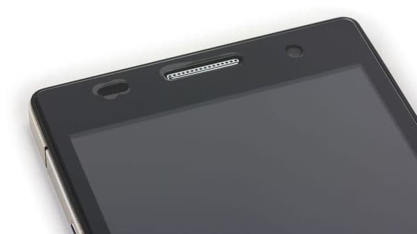 Лицевая часть передней панели полностью прикрыта плоским защитным стеклом без бортиков, в нем вырезано отверстие для аккуратной блестящей хромированной решетки разговорного динамика. Рядом виднеются глазки фронтальной камеры и сенсоров. К сожалению, создатели не предусмотрели никакого индикатора для оповещений, являющегося очень полезным элементом.