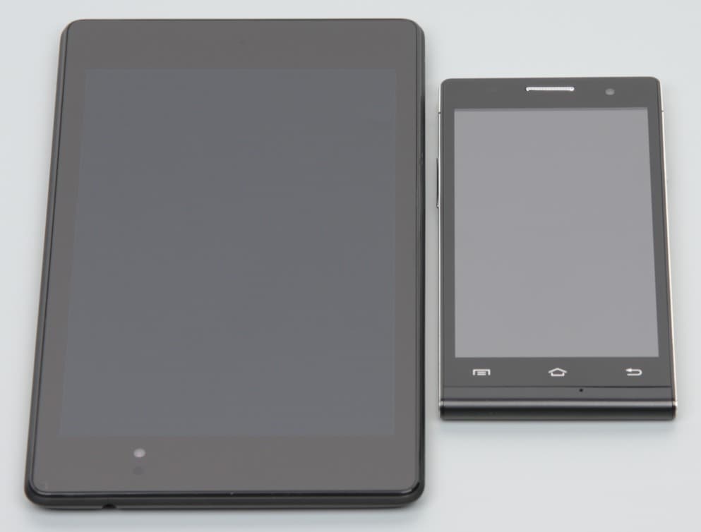 На экран этого смартфона изначально явно фабричным способом была наклеена защитная пленка, которую мы удалили. Лицевая поверхность экрана выполнена в виде стеклянной пластины с зеркально-гладкой поверхностью, устойчивой к появлению царапин. Судя по отражению объектов антибликовые свойства экрана заметно хуже, чем у экрана Google Nexus 7 (2013) (далее просто Nexus 7). Для наглядности приведем фотографию, на которой в выключенных экранах обоих устройств отражается белая поверхность (BQ Harvard — справа, далее их можно различать по размеру):