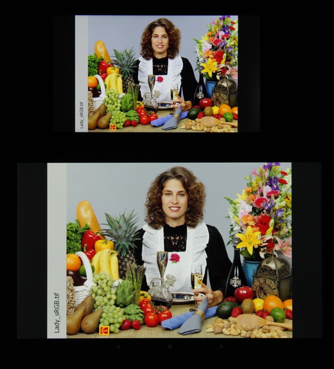 При этом координаты первичных цветов не очень далеко отстоят от соответствующих вершин sRGB, в итоге цвета изображений — рисунков, фотографий и фильмов, — ориентированных на пространство sRGB (а таких подавляющее большинство), имеют естественные насыщенность и оттенок. Баланс оттенков на шкале серого неидеальный, так как цветовая температура выше стандартных 6500 К, но отклонение от спектра абсолютно черного тела (ΔE) меньше 10, что для потребительского устройства считается приемлемым показателем. При этом вариация цветовой температуры и ΔE небольшая, что положительно сказывается на визуальном восприятии цветового баланса. (Темные области шкалы серого можно не учитывать, так как там баланс цветов не имеет большого значения, да и погрешность измерений цветовых характеристик на низкой яркости большая.)