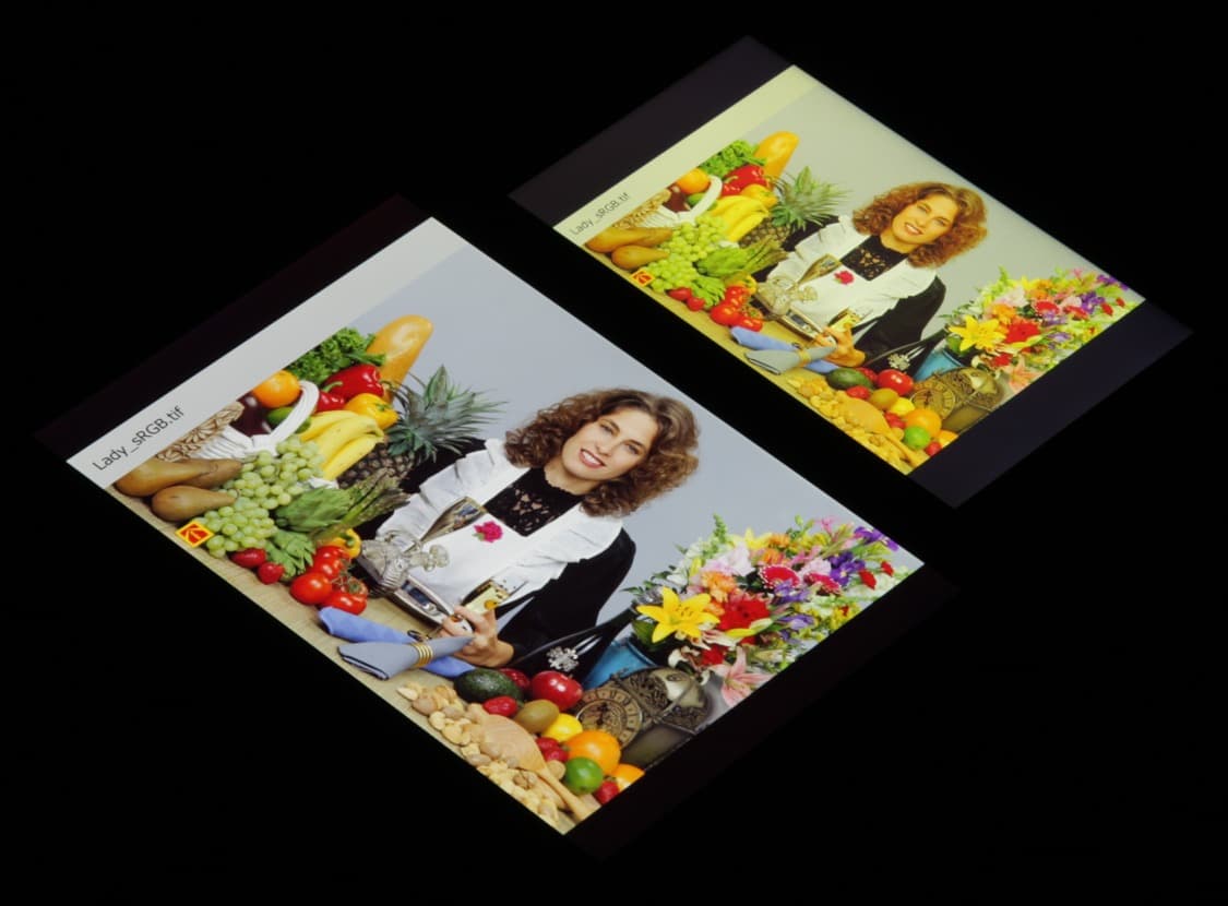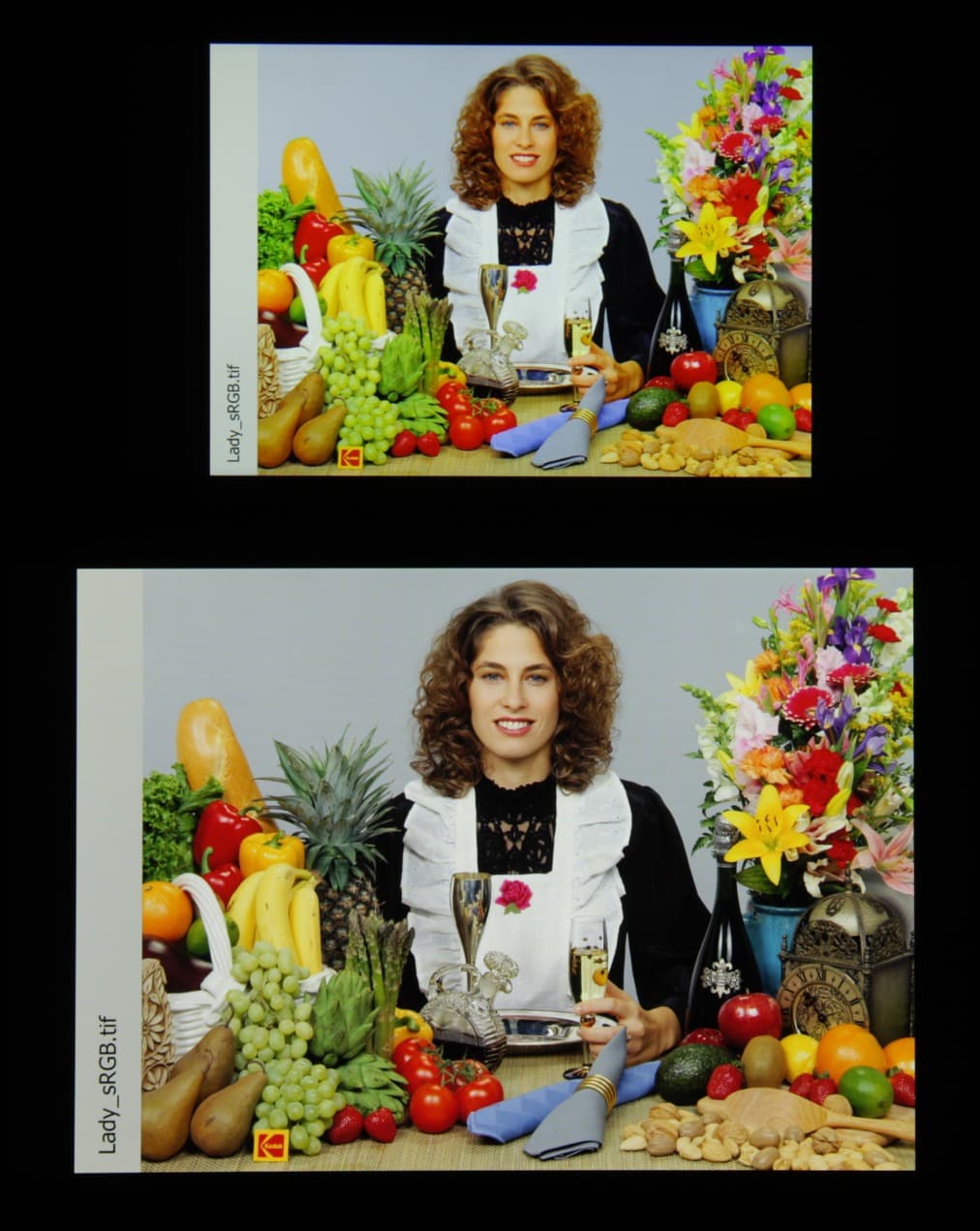 В итоге цвета имеют близкую к естественной насыщенность, но, видимо, даже такого отличия в охвате от стандартного хватило, чтобы лица людей стали нездорово желтушными. Баланс оттенков на шкале серого средний, так как цветовая температура выше стандартных 6500 К и отклонение от спектра абсолютно черного тела (ΔE) больше 10 на большинстве оттенков серого, что даже для потребительского устройства считается плохим показателем. При этом цветовая температура и ΔE мало изменяются от оттенка к оттенку — это положительно сказывается на визуальной оценке цветового баланса. (Самые темные области шкалы серого можно не учитывать, так как там баланс цветов не имеет большого значения, да и погрешность измерений цветовых характеристик на низкой яркости большая.)