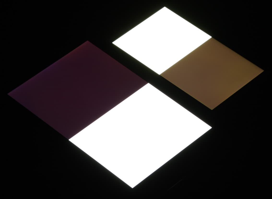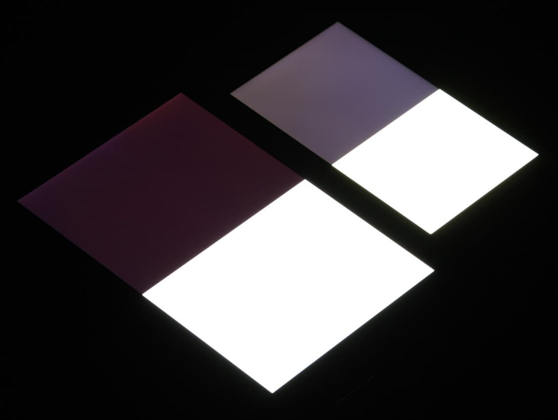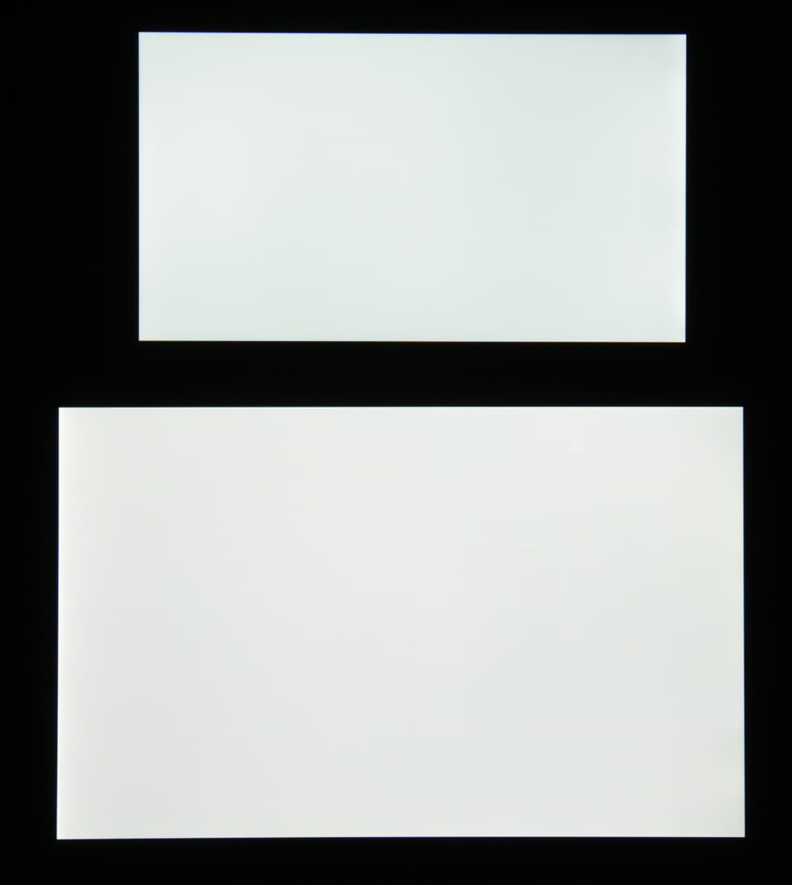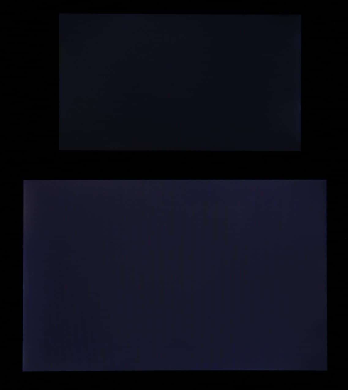 Яркость под углом у экранов уменьшилась (как минимум в 5 раз, исходя из разницы в выдержке), но у BQ Wide экран немного светлее. Черное поле при отклонении по диагонали высветляется сильно и приобретает коричневатый или красно-фиолетовый оттенок. Фотографии ниже это демонстрируют (яркость белых участков в перпендикулярном плоскости экранов направлении одинаковая!):