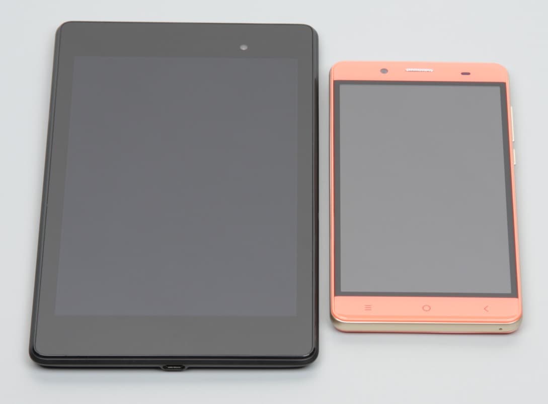 Лицевая поверхность экрана выполнена в виде стеклянной пластины с зеркально-гладкой поверхностью, устойчивой к появлению царапин. Судя по отражению объектов, антибликовые свойства экрана гораздо хуже, чем у экрана Google Nexus 7 (2013) (ниже просто Nexus 7). Для наглядности приведем фотографию, на которой в выключенных экранах отражается белая поверхность (слева — Nexus 7, справа — BQ Wide, далее их можно различать по размеру):