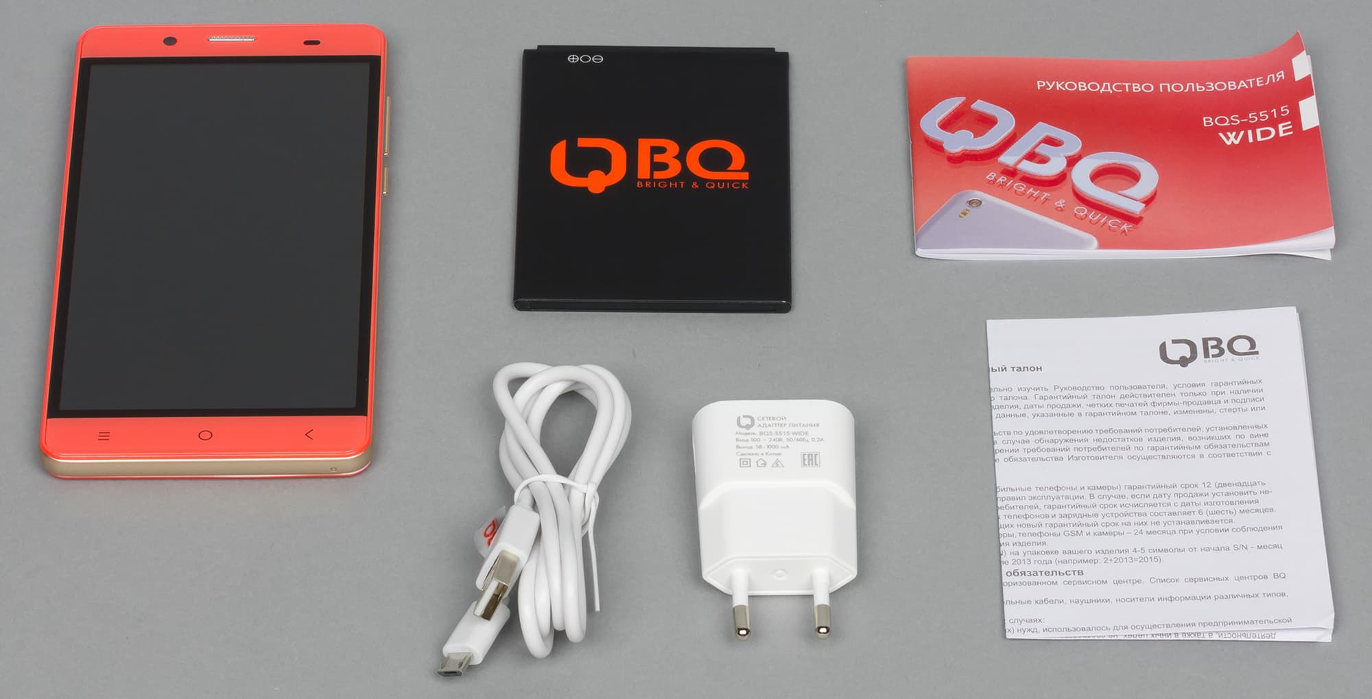 В комплекте с BQ Wide идет всего лишь компактное и не слишком мощное сетевое зарядное устройство с максимальным выходным током 1 А при напряжении 5 В, соединительный USB-кабель и пара тонких книжиц бумажной документации. Так что упаковка явно могла бы быть и поменьше.