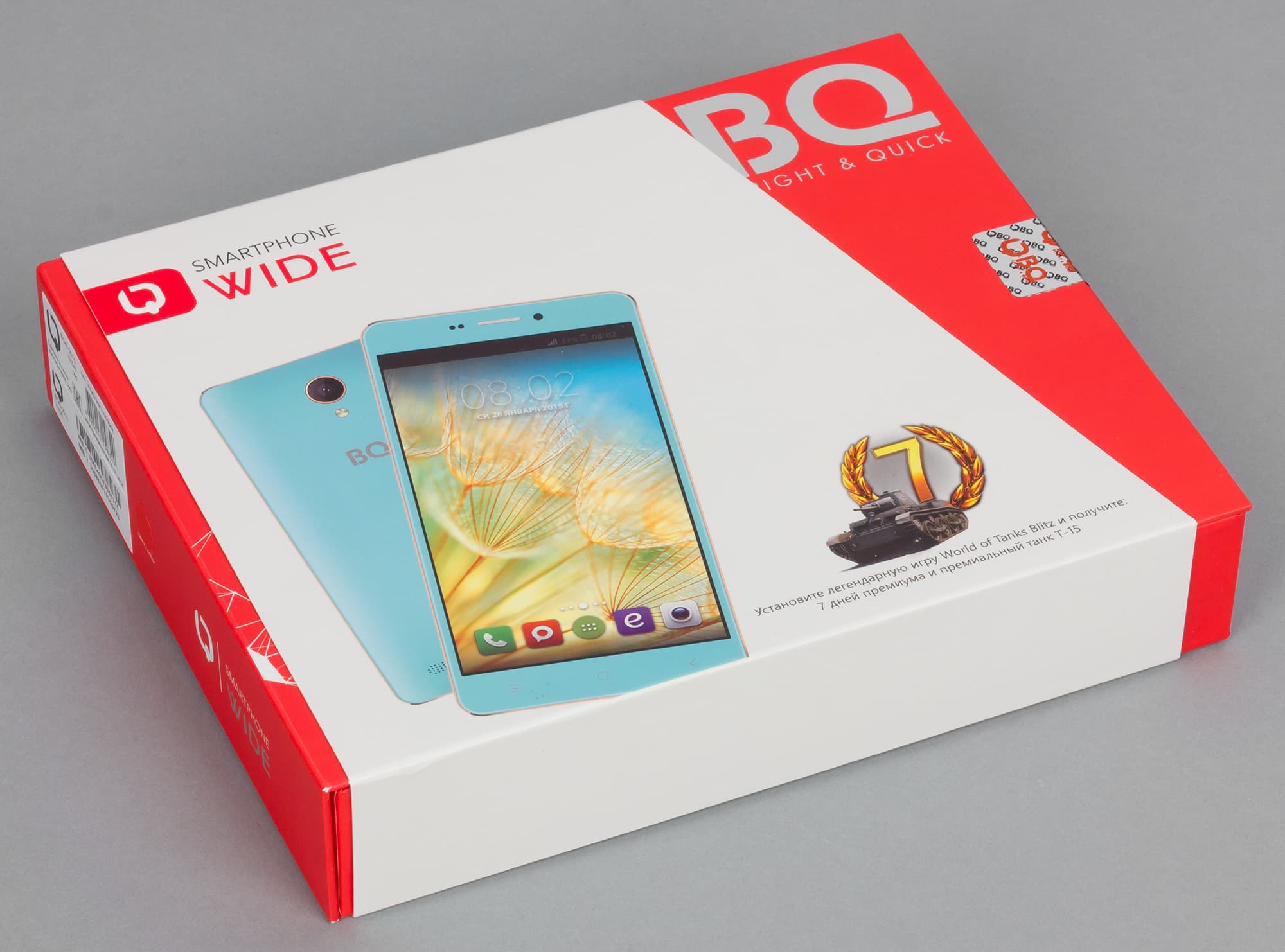 BQ Wide продается в довольно крупной плоской картонной коробке прямоугольной формы. Упаковка очень проста, аляповатое яркое оформление и дешевый вид однозначно дают с первого же взгляда понять, что перед нами максимально бюджетный продукт без претензий.