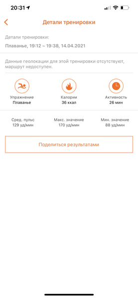 Но раз производитель предлагает такую опцию — почему бы не опробовать ее. Мы протестировали часы в бассейне. Их работоспособность после получасовой тренировки в воде не нарушилась, но гарантировать, что так же будет и при более длительных и глубоких погружениях, мы не можем. Впрочем, результаты тренировки, доступные в приложении, нас совсем не порадовали. Всё, что часы могут в этом режиме — зафиксировать продолжительность плавания, отследить пульс и посчитать калории. Никаких сведений о расстоянии, стилях, эффективности гребков (SWOLF) и прочего здесь нет.