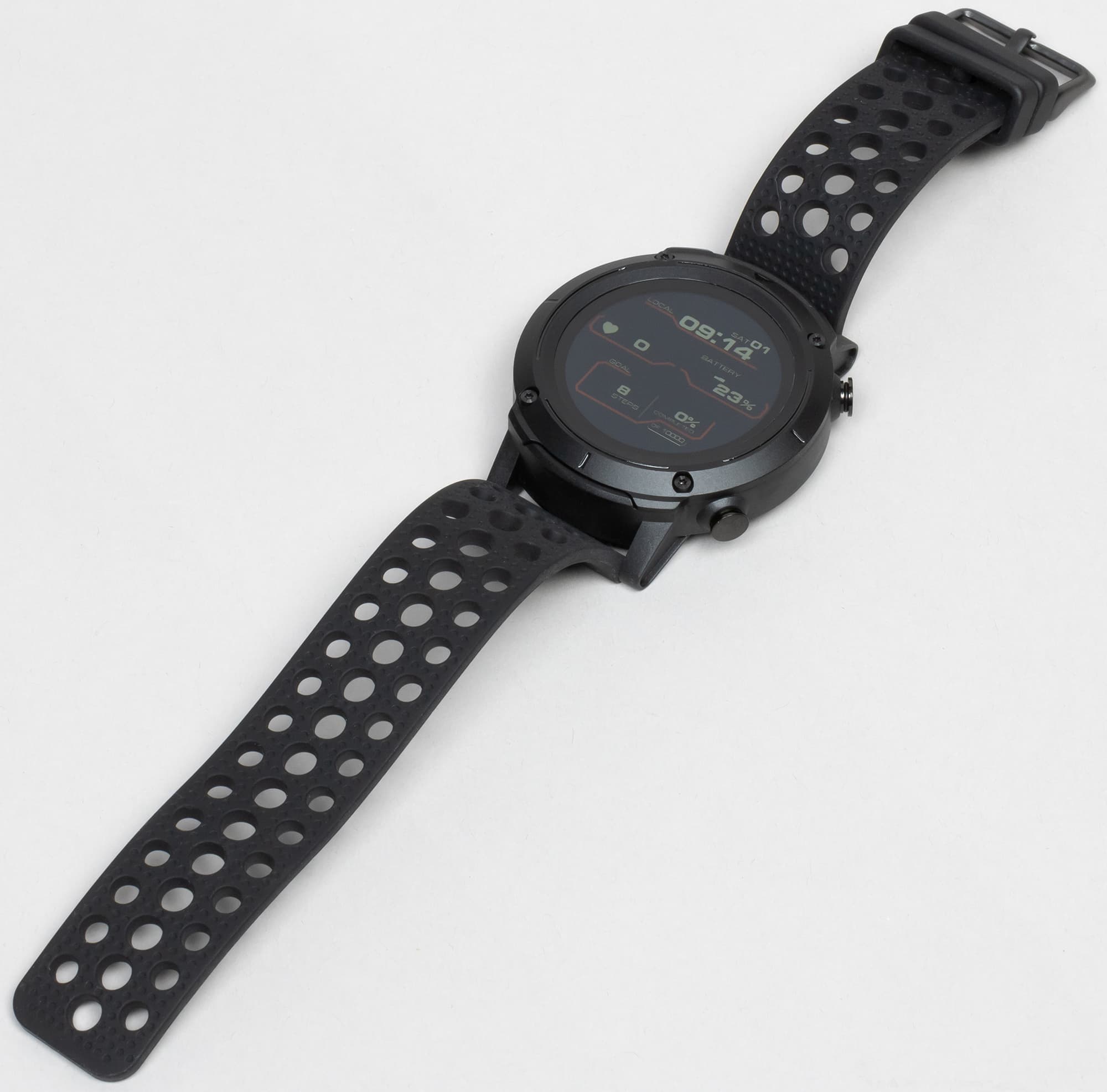 Помимо самого корпуса в глаза бросается и ремешок: он выполнен из силикона и имеет множество отверстий разного размера — сделано это для того, чтобы рука меньше потела, а часы сидели при этом максимально удобно. К слову, ремешки с похожим расположением отверстий выпускает Nike для Apple Watch. Ремешок стандартной ширины 20 мм и стандартного же крепления на металлических спицах, так что вполне можно приобрести и альтернативные варианты.