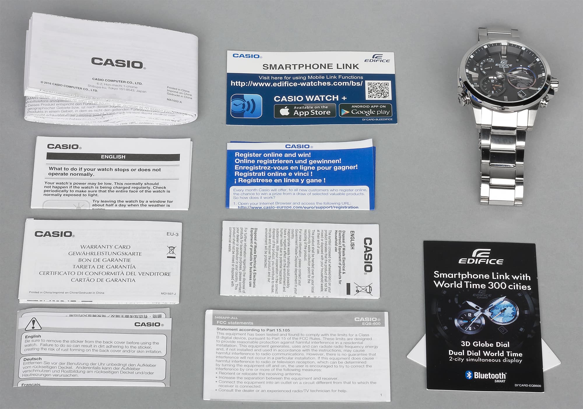 Никаких специфических компонентов в комплектации нет. Но само обилие печатной продукции придает Casio Edifice EQB-600 шарм дорогого продукта.