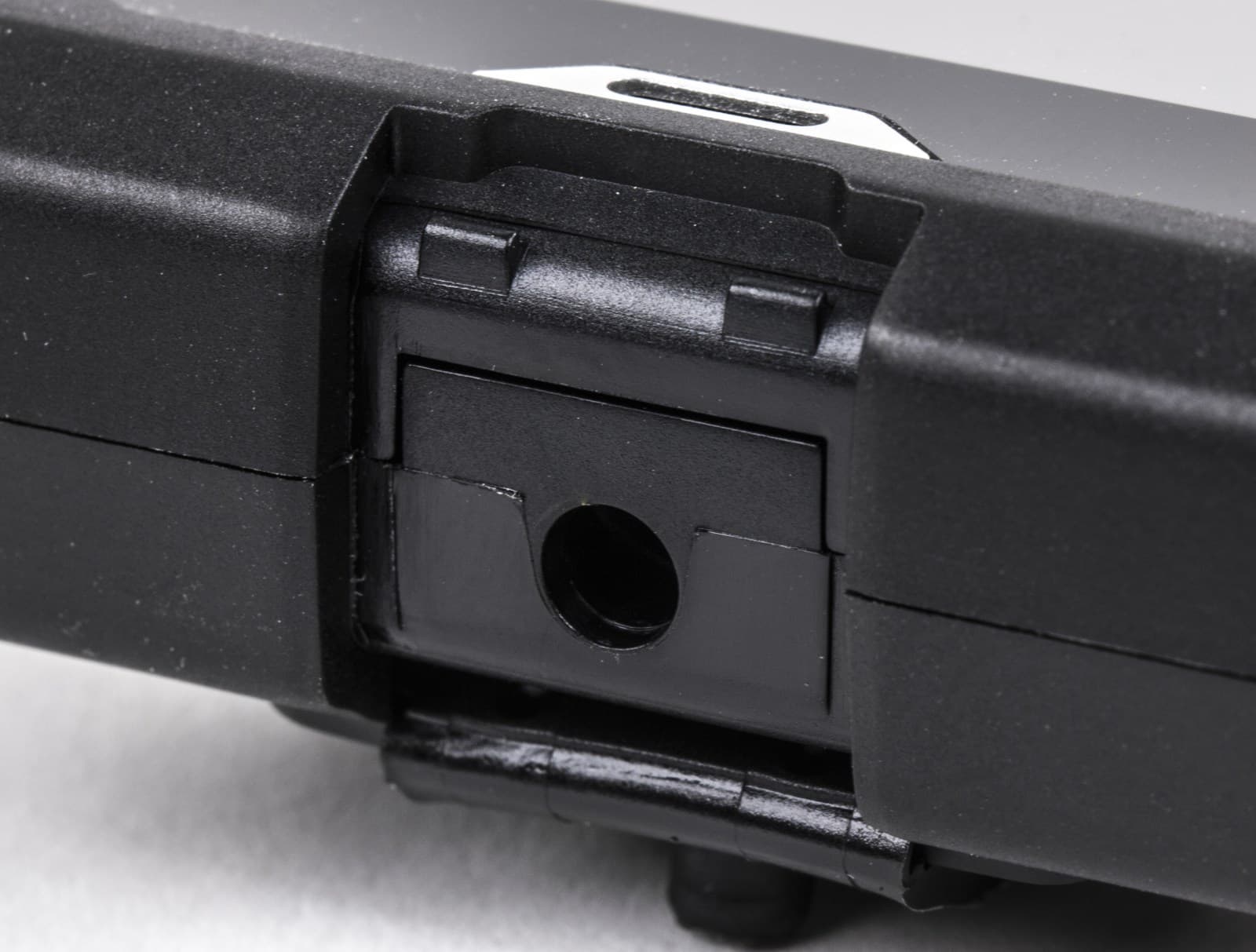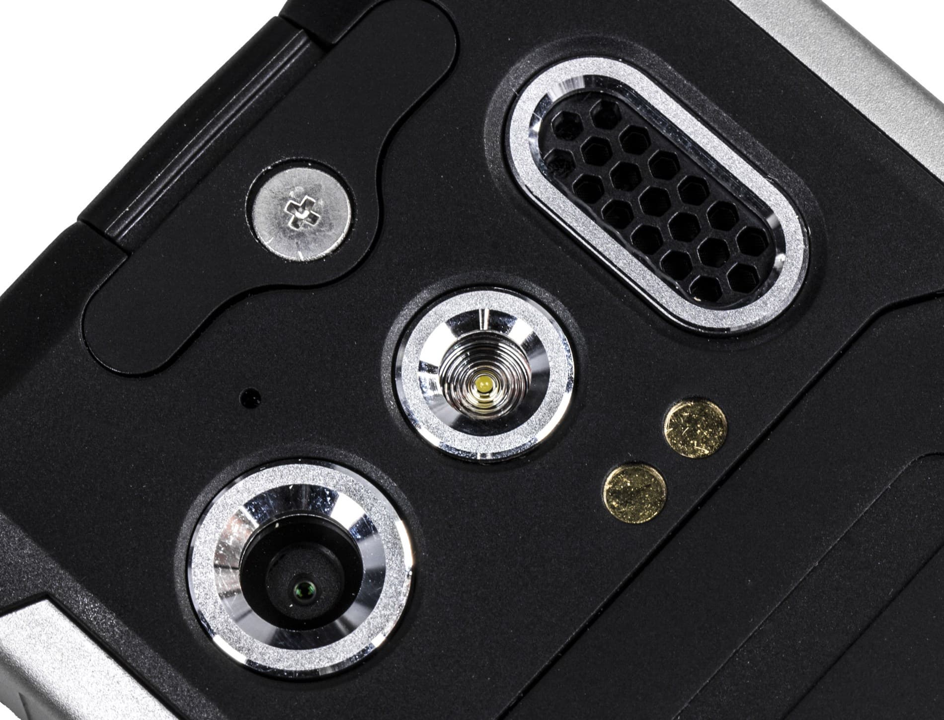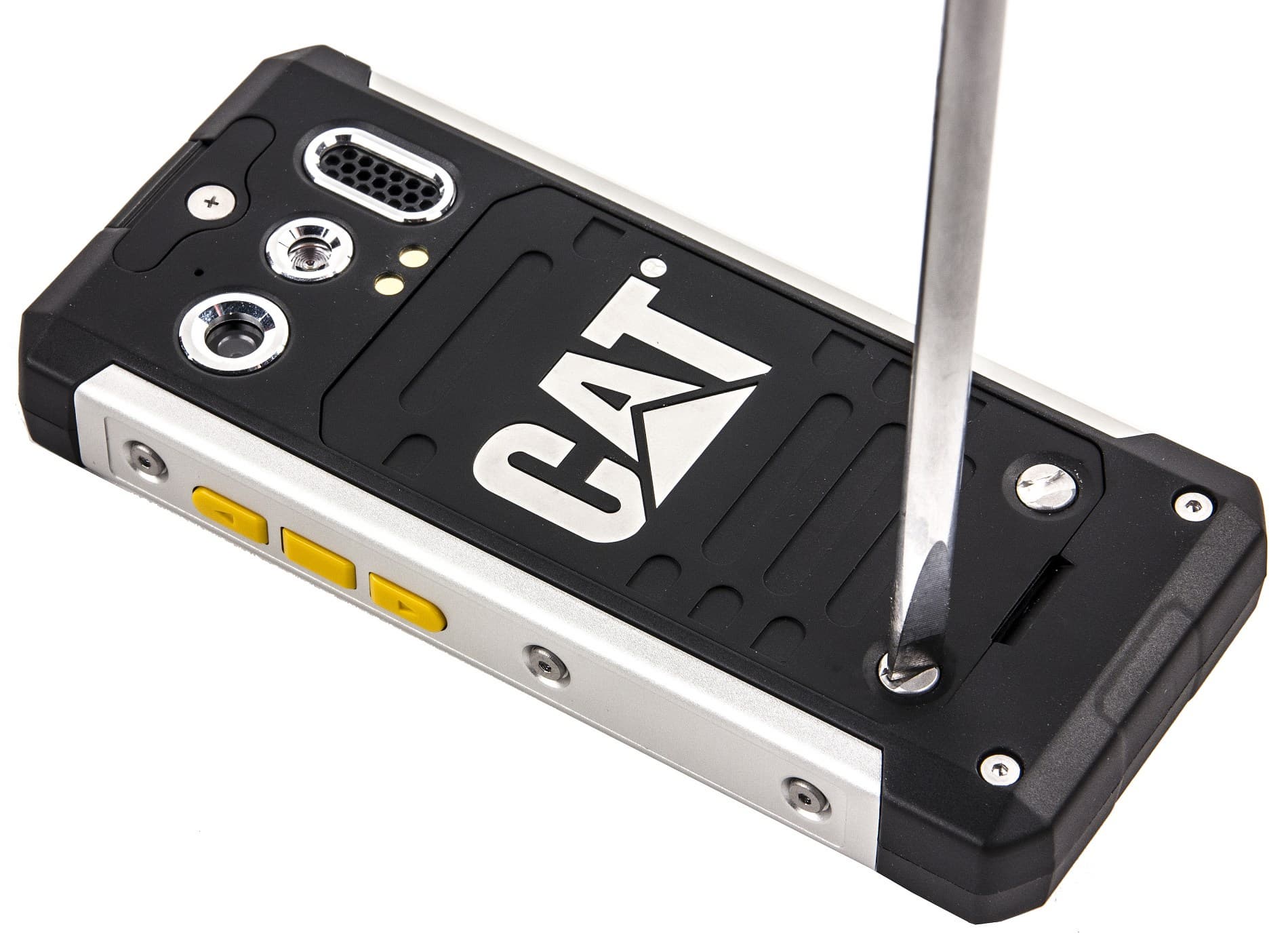 Компоновка подвижных крепежей Cat B100 выглядит продуманной. Крупные винты, удерживающие заднюю крышку, можно выкручивать пальцем. Для замены заглушек потребуется маленькая крестовая отвертка. А чтобы основательно разобрать корпус, придется найти крошечный шестигранник.