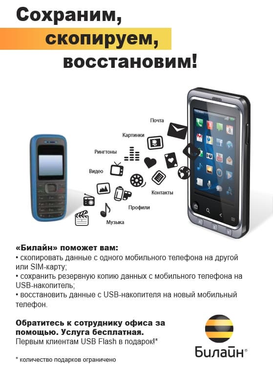 В самом конце апреля отечественный оператор сотовой связи «ВымпелКом» (бренд «Билайн») опубликовал официальный пресс-релиз, посвященный предоставлению новой услуги абонентам: возможности скопировать данные с одного телефона на другой. Начиная с этого месяца все желающие (в том числе и абоненты других операторов связи) могут посетить салоны Билайн и перенести всю необходимую информацию (контакты, SMS-сообщения, фотографии, загрузки, приложения) с телефона на телефон, с SIM-карты на SIM-карту, а также с SIM-карты на телефон и с телефона на SIM-карту. Помимо переноса данных, пользователи также могут создать резервную копию и восстановить данные с USB-накопителя.