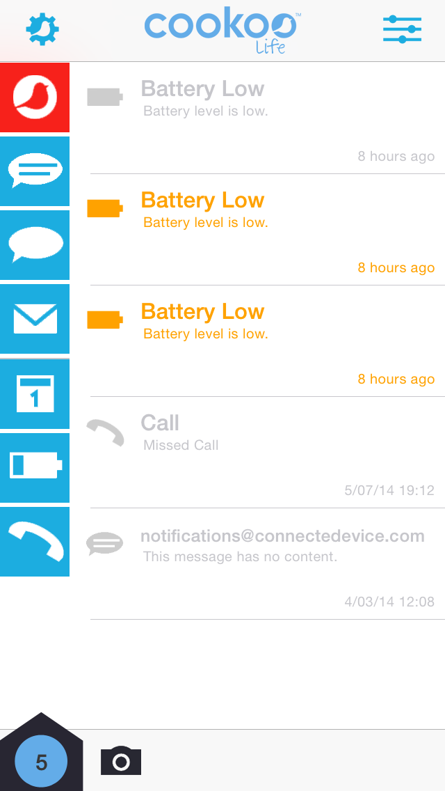 Кликнув на домик, мы можем нажать Connect (если часы пока еще не подключены) и Disconnect (если часы подключены). Нажав на круглую кнопку внизу, мы попадаем в меню уведомлений. Здесь отображаются приходившие на часы уведомления (спрашивается: зачем, если эти уведомления и так есть на смартфоне?). В правом верхнем углу — кнопка настроек уведомлений, где мы можем выбрать, какого типа уведомления хотим получать.