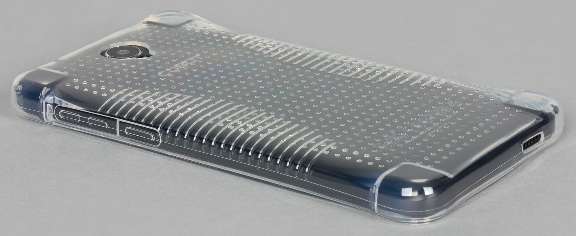 Смартфон сам по себе очень крупный, а в таком чехле он становится еще более громоздким. Изменяет чехол и внешний вид: аппарат в нем становится похож на защищенное устройство с противоударными функциями, довольно брутальное. Собственно, чехол действительно добавляет защитных функций, поскольку имеет и насечки для надежного удержания в руке, и утолщения на углах для защиты при падениях.
