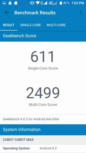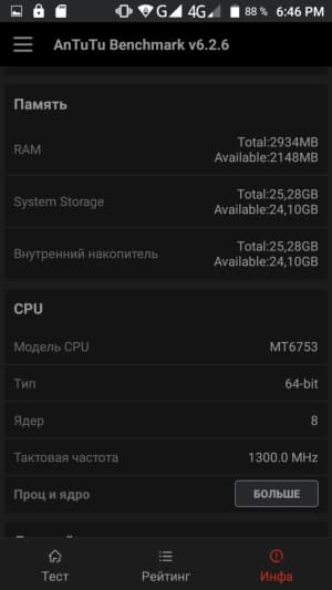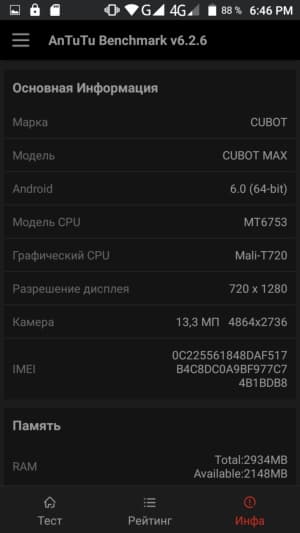Аппаратная платформа Cubot Max строится на базе восьмиядерной однокристальной системы (SoC) MediaTek MT6753А. В конфигурацию SoC входит восемь процессорных ядер Cortex-A53, работающих на частоте до 1,3 ГГц. За обработку графики отвечает видеоускоритель Mali-T720. Объем ОЗУ составляет 3 ГБ, что неплохо, места для файлов и приложений — 32 ГБ, и из них изначально для нужд пользователя доступно 25 ГБ. В реальности после перезагрузки, очистки памяти и закрытия всех приложений свободно около 1,8 из 2,9 ГБ ОЗУ.