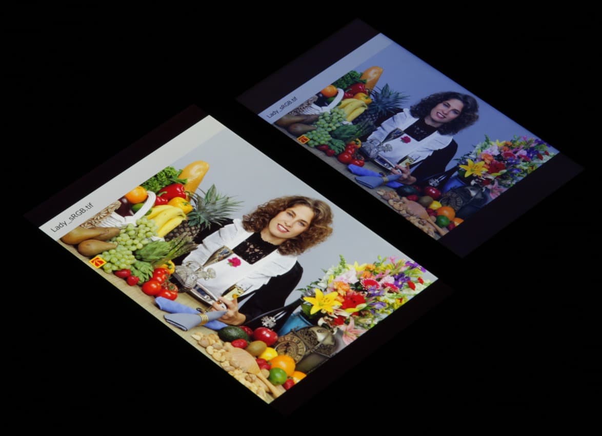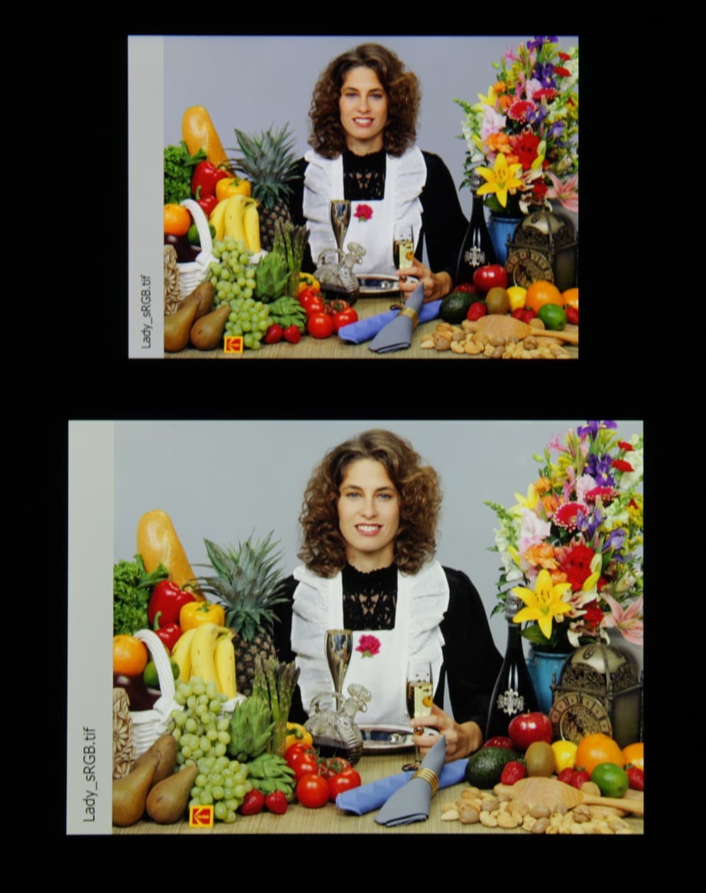 В итоге цвета имеют естественную насыщенность. Баланс оттенков на шкале серого приемлемый, так как цветовая температура на большей части шкалы несильно выше стандартных 6500 К, да и отклонение от спектра абсолютно черного тела (ΔE) ниже 3, что для потребительского устройства считается хорошим показателем. При этом цветовая температура и ΔE опять же на большей части шкалы мало изменяются от оттенка к оттенку — это положительно сказывается на визуальной оценке цветового баланса. (Самые темные области шкалы серого можно не учитывать, так как там баланс цветов не имеет большого значения, да и погрешность измерений цветовых характеристик на низкой яркости большая.)
