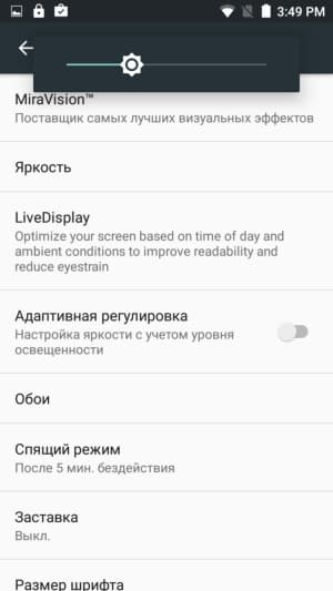 Яркость дисплея можно подстраивать вручную или задавать автоматические настройки, основанные на работе датчика внешнего освещения. Тест AnTuTu диагностирует поддержку 5 одновременных касаний мультитач. Есть возможность активации экрана двойным постукиванием по стеклу.