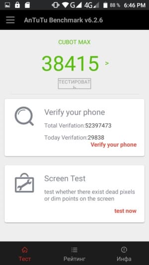 Съемная аккумуляторная батарея, установленная в Cubot Max, имеет довольно большую емкость в 4100 мА·ч. И конечно, слабенький смартфон с невысоким разрешением экрана и с такой большой батареей демонстрирует уровень автономности выше среднего. Однако этот уровень именно немногим выше среднего, но далеко не рекордный. Из аккумулятора подобной емкости явно можно вытянуть больше, но, впрочем, неизвестно, верное ли значение емкости указали китайцы или слукавили, как это часто с ними бывает.
