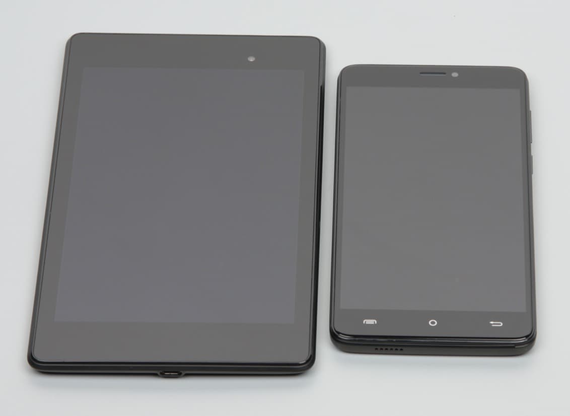 Лицевая поверхность экрана выполнена в виде стеклянной пластины с зеркально-гладкой поверхностью, устойчивой к появлению царапин. Судя по отражению объектов, антибликовые свойства экрана немного лучше, чем у экрана Google Nexus 7 (2013) (ниже просто Nexus 7). Для наглядности приведем фотографию, на которой в выключенных экранах отражается белая поверхность (слева — Nexus 7, справа — Cubot Max, далее их можно различать по размеру):