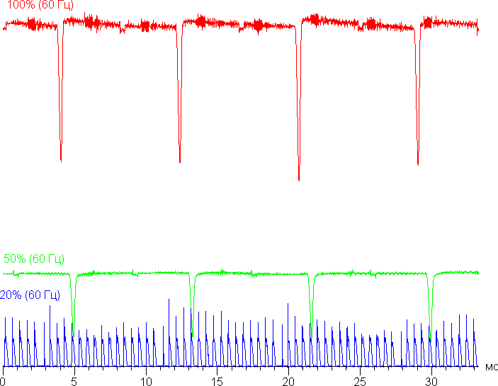 На высоком и среднем уровне яркости присутствует значимая модуляция с частотой 120 Гц. На рисунках ниже приведены зависимости яркости (вертикальная ось) от времени (горизонтальная ось) для нескольких значений настройки яркости: