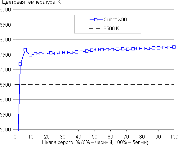 Баланс оттенков на шкале серого средний, так как цветовая температура выше стандартных 6500 К, а отклонение от спектра абсолютно черного тела (ΔE) существенно растет по мере снижения светлоты оттенка, что отрицательно сказывается на визуальной оценке цветового баланса.