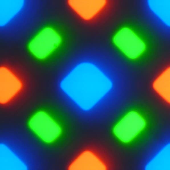 В этом экране используется матрица AMOLED — активная матрица на органических светодиодах. Полноцветное изображение создается с помощью субпикселей трех цветов — красного (R), зеленого (G) и синего (B), но красных и синих субпикселей в два раза меньше, что можно обозначить как RGBG. Это подтверждается фрагментом микрофотографии: