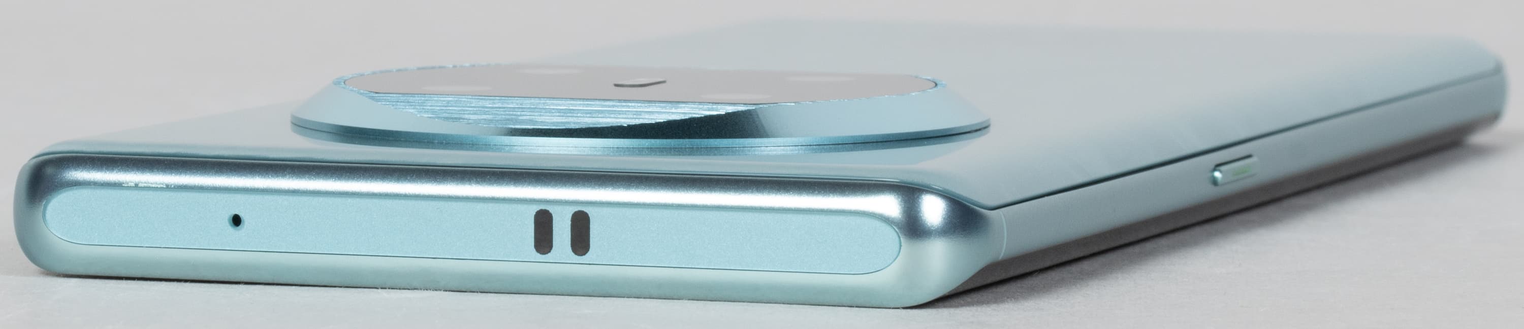 На верхнем торце есть отверстие дополнительного микрофона и две неопознанные полоски — то ли украшение, то ли попытка ввести в заблуждение невнимательного покупателя. В любом случае, это не прорези, второго динамика за ними нет, ИК-порта у смартфона тоже нет. На всякий случай добавим, что нет и аудиовыхода 3,5 мм на миниджек проводных наушников.