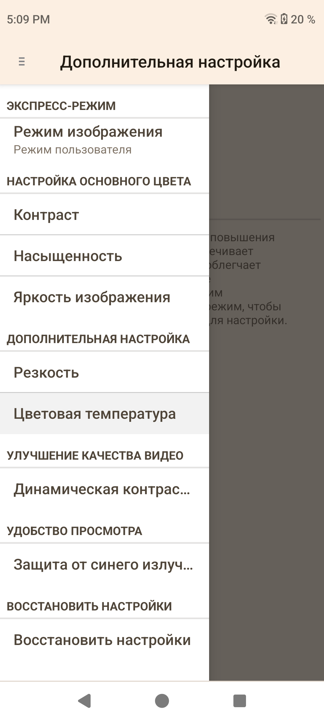 Однако любая попытка как-либо изменить яркостный или цветовой баланс с помощью этих настроек или ни к чему не приводит, или приводит к совершенно неадекватным искажениям цветов. Помогает только пункт Восстановление настроек.