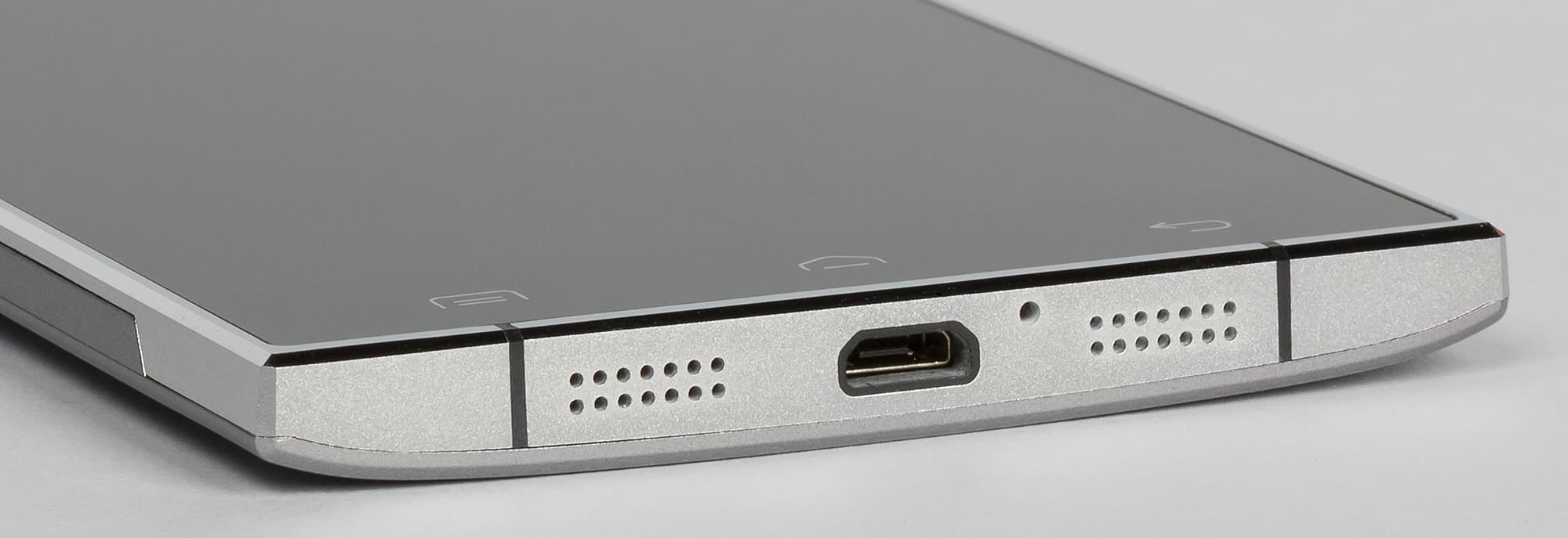 По обеим сторонам от разъема Micro-USB располагаются массивы мелких круглых отверстий, но, как водится, лишь через одну из этих стилизированных решеток выходит звук основного динамика, в то время как вторая является бутафорией (в этом легко убедиться, поочередно прикрывая решетки пальцем). Для разговорного микрофона вырезано отдельное круглое отверстие размером побольше. Отверстие второго, вспомогательного микрофона вынесено не на верхний торец, а на заднюю сторону смартфона, оно размещено рядом с модулем камеры.
