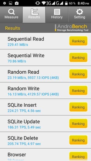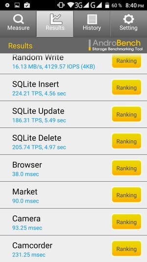 Результаты теста AndroBench на скорость работы с памятью: