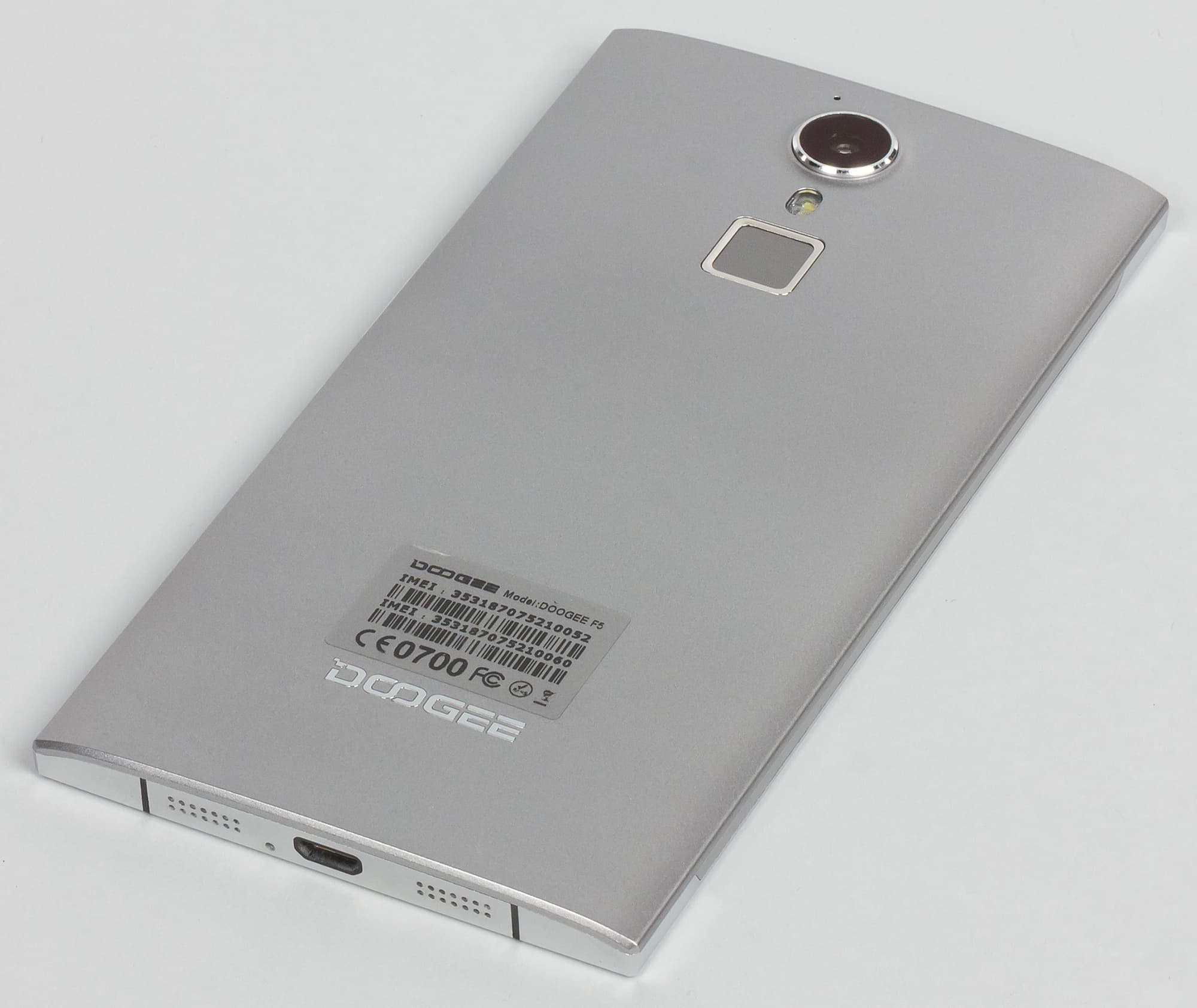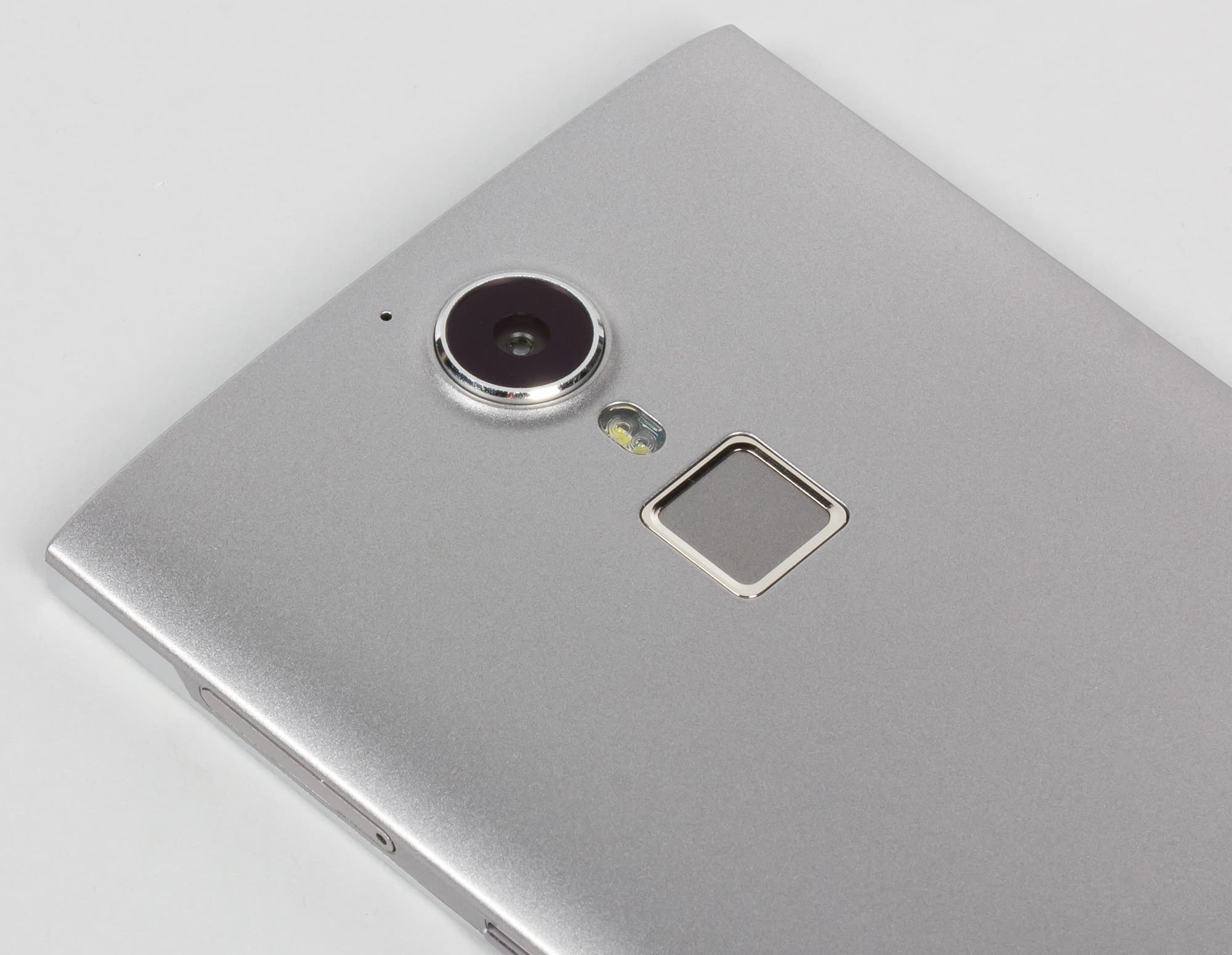 На задней стороне корпуса привычно разместились камера со вспышкой, а рядом с ними — сенсорная площадка со сканером отпечатков пальцев. Модуль камеры заметно выпирает за пределы корпуса, из-за него лежащий на твердой поверхности аппарат покачивается при прикосновениях к экрану. Работать с Doogee F5 в таком положении неудобно, этот вопрос разработчики продумали плохо. Площадка сканера, наоборот, немного утоплена вглубь, проще всего ее нащупывать указательным пальцем.