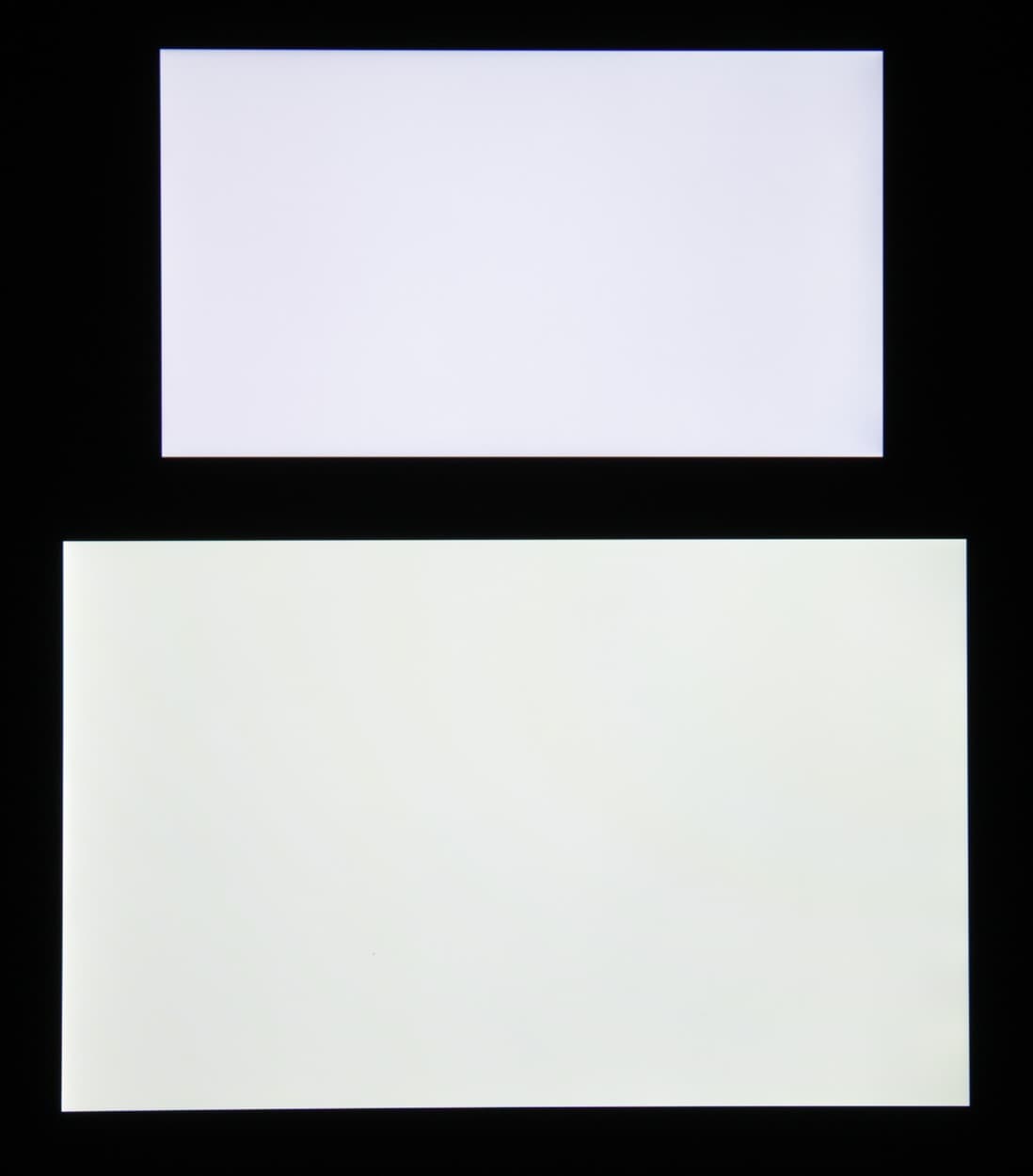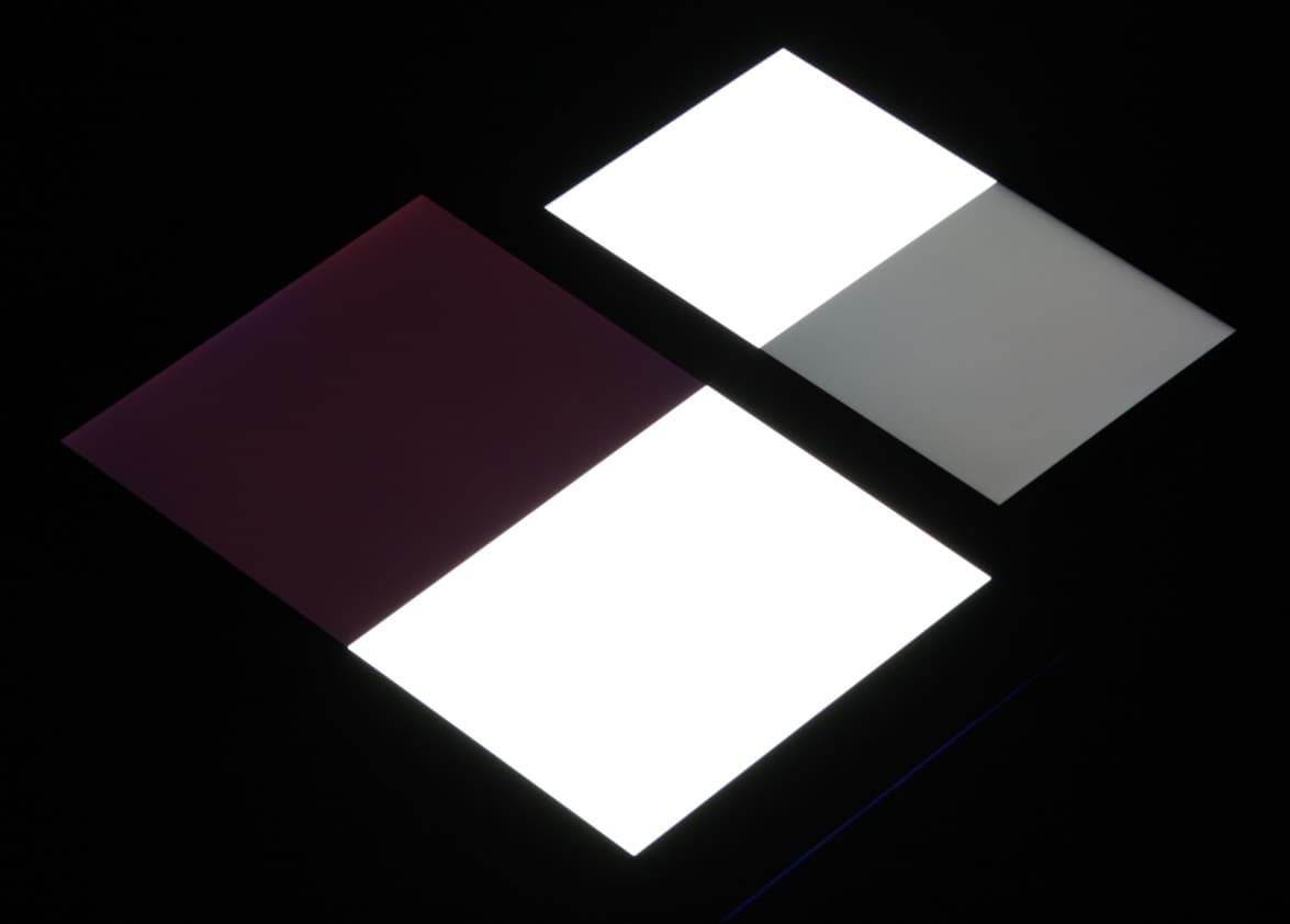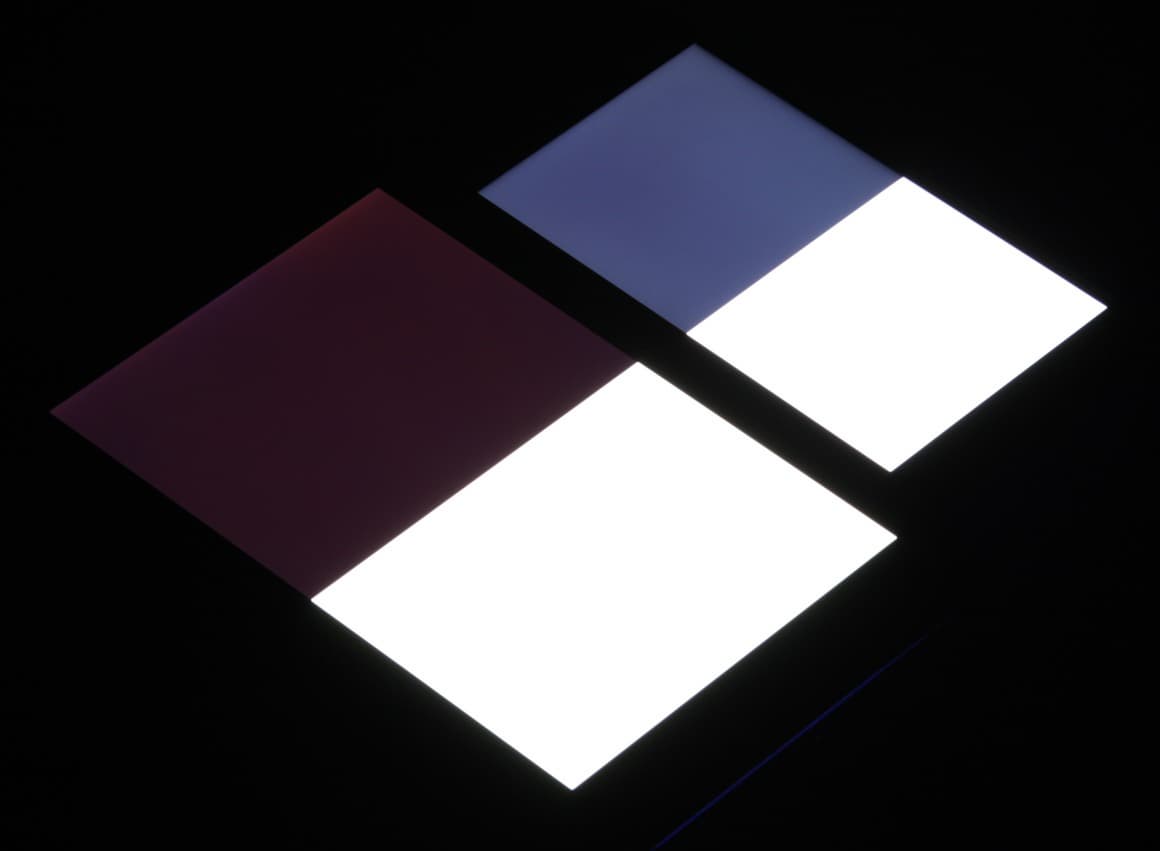 Яркость под углом у экранов уменьшилась (как минимум в 5 раз, исходя из разницы в выдержке), но у Doogee F5 экран чуть-чуть темнее (средняя яркость по фотографиям 231 против 234 у Nexus 7). Черное поле при отклонении по диагонали высветляется сильно и приобретает легкий фиолетовый оттенок или остается условно нейтрально-серым. Фотографии ниже это демонстрируют (яркость белых участков в перпендикулярном плоскости экранов направлении одинаковая!):